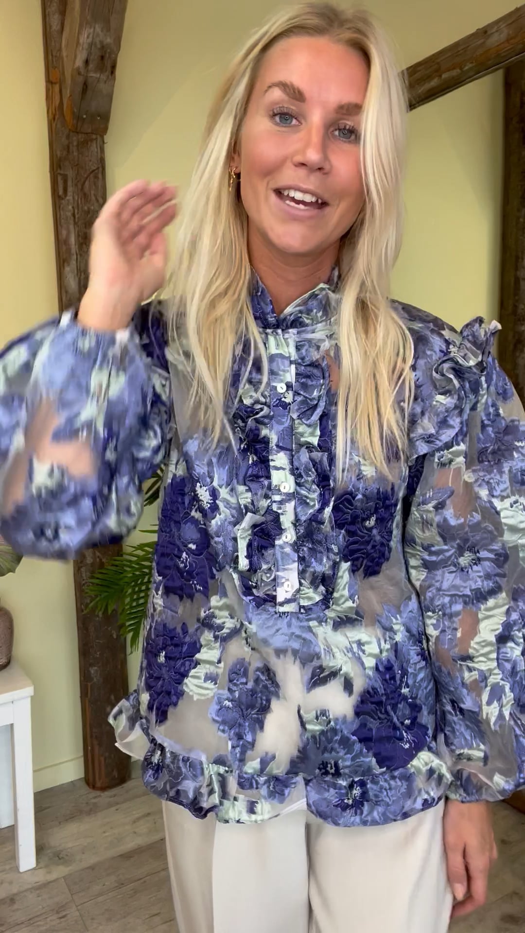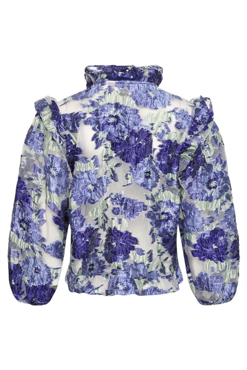 Den smukkeste bluse fra Noella! En bluse med flæsedetaljer ved skuldrene, ned midt på blusen ved knapperne, forneden samt en højere flæsekant ved halsen. Derudover er der elastik i ærmerne ved håndleddet, hvilket giver blusen de fineste ballonærmer. Style blusen med en fin nederdel eller et par pænere habitbukser, for et festligt look.