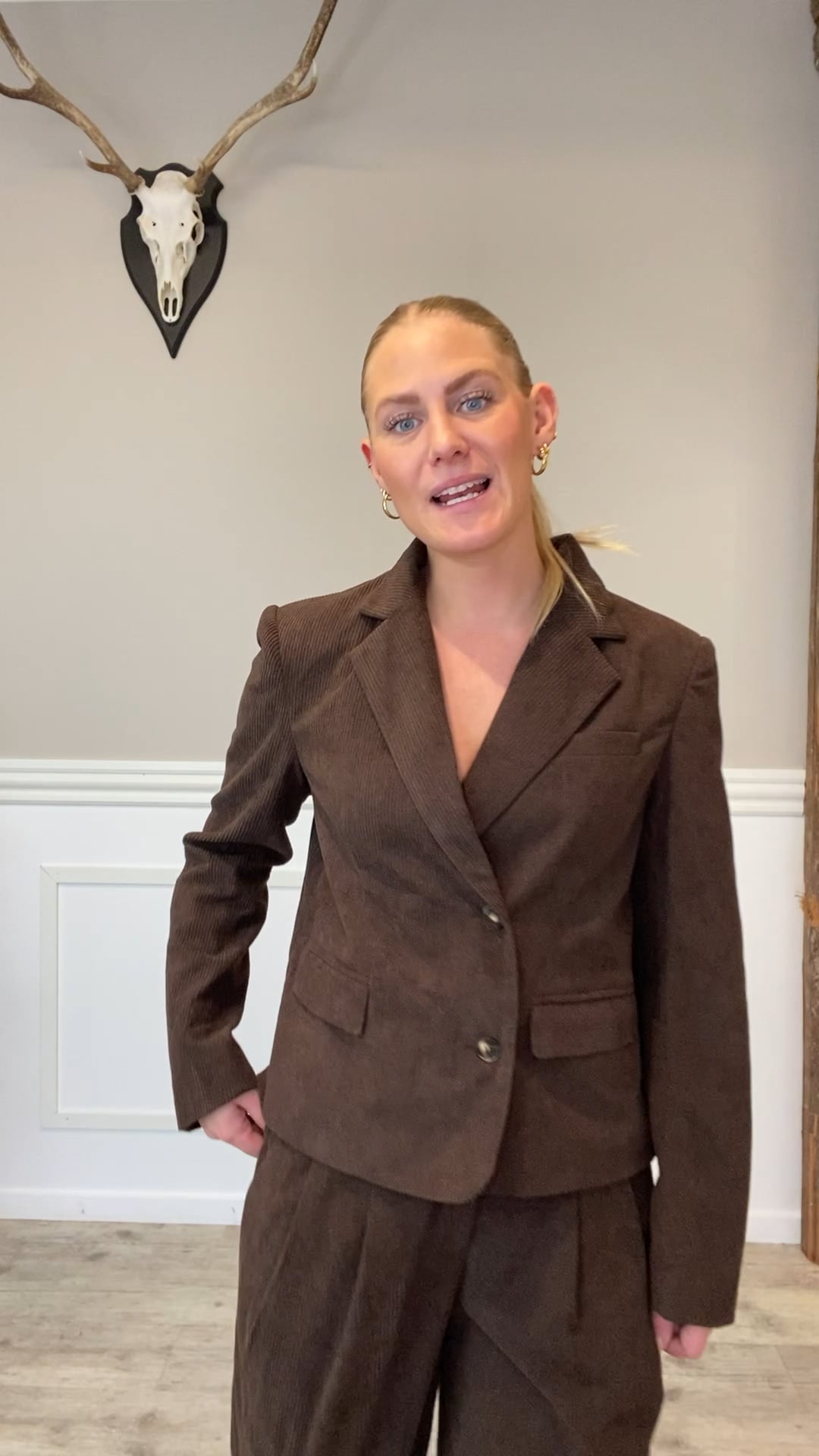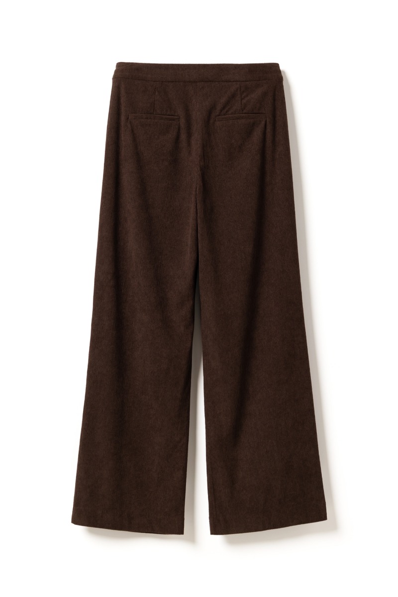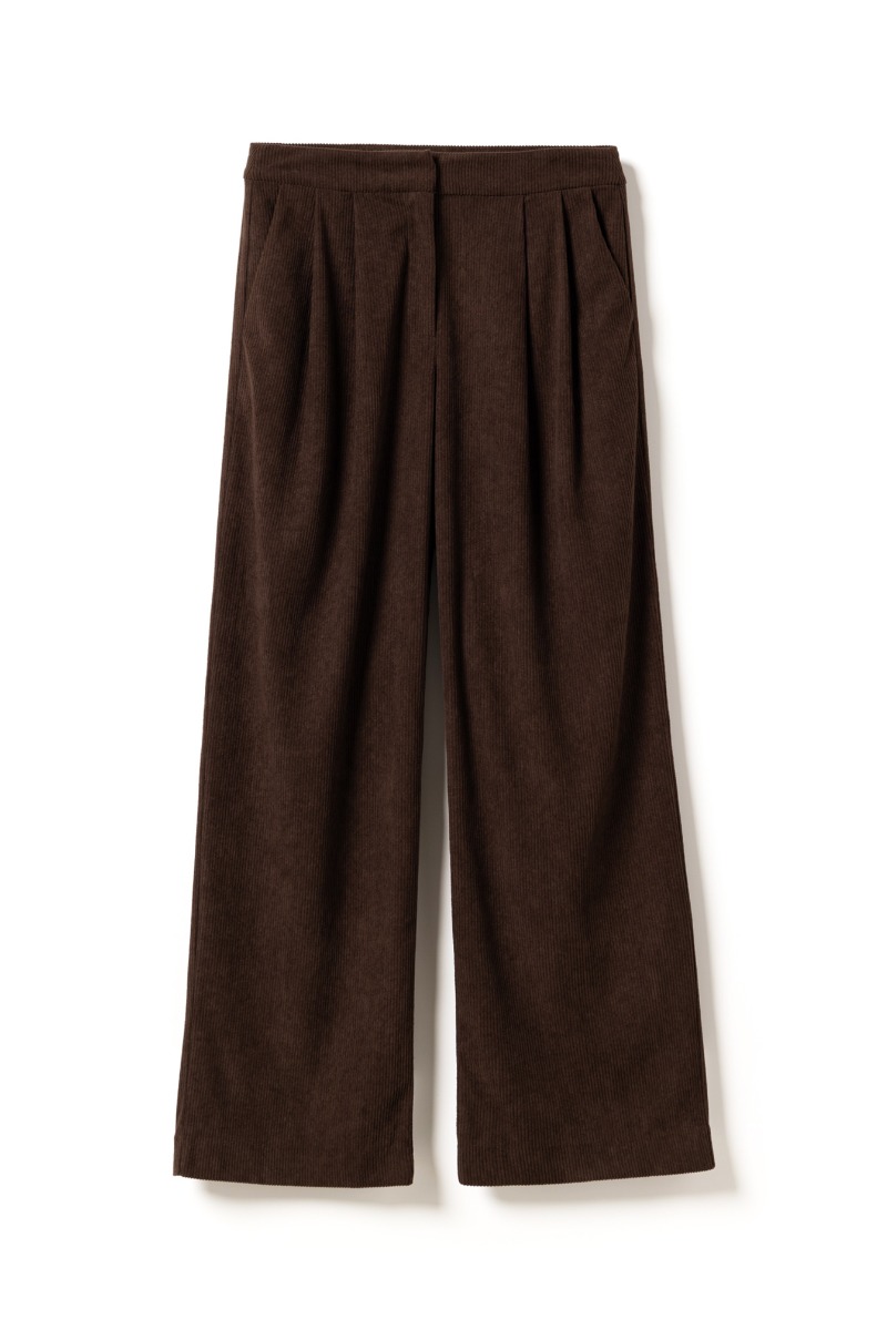 Disse bukser i mørk chokoladebrun fløjl kombinerer komfort med et elegant og afslappet udtryk. De er designet med vide ben og fine læg foran, der giver en flatterende silhuet og et let fald i stoffet. Materialet har en blød struktur, som både tilfører varme og et luksuriøst præg, perfekt til efterår og vinter. Bukserne kan styles på mange måder – med en enkel skjorte og loafers for et klassisk look, eller med en strik og sneakers for en mere casual hverdagsstil. Den rige brune farve gør dem alsidige og nemme at kombinere med både neutrale toner og mere markante farver.