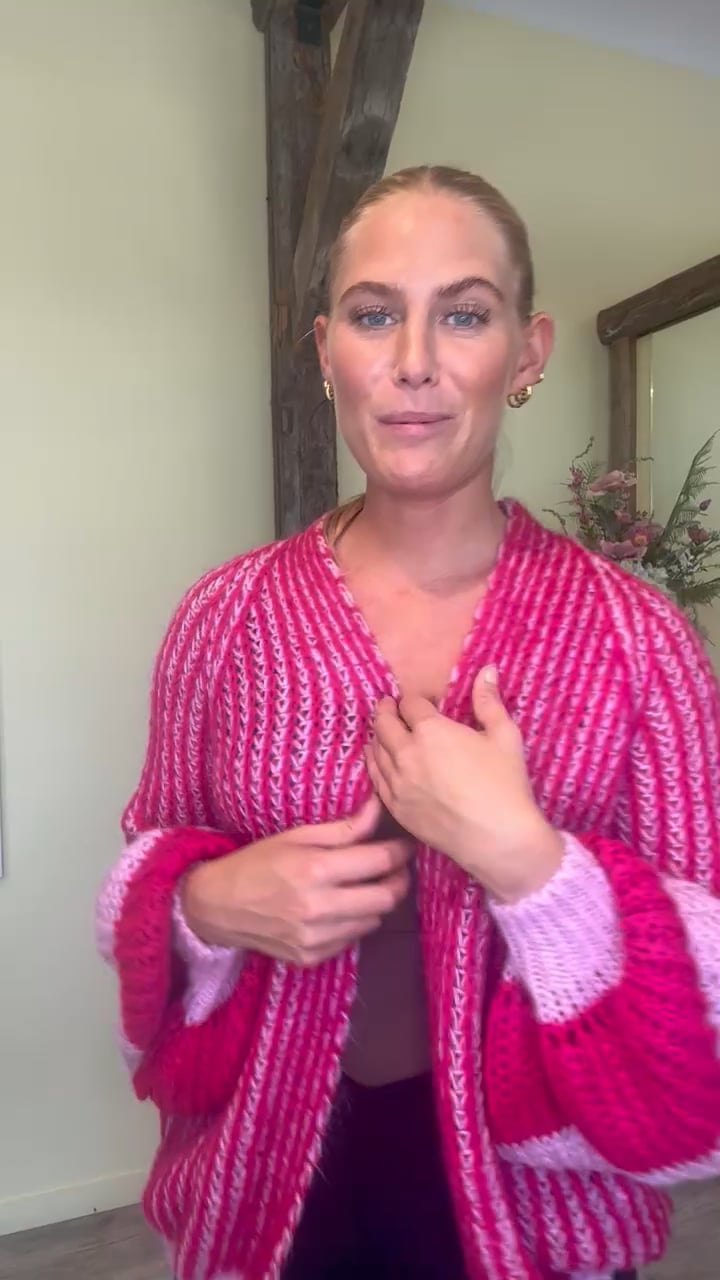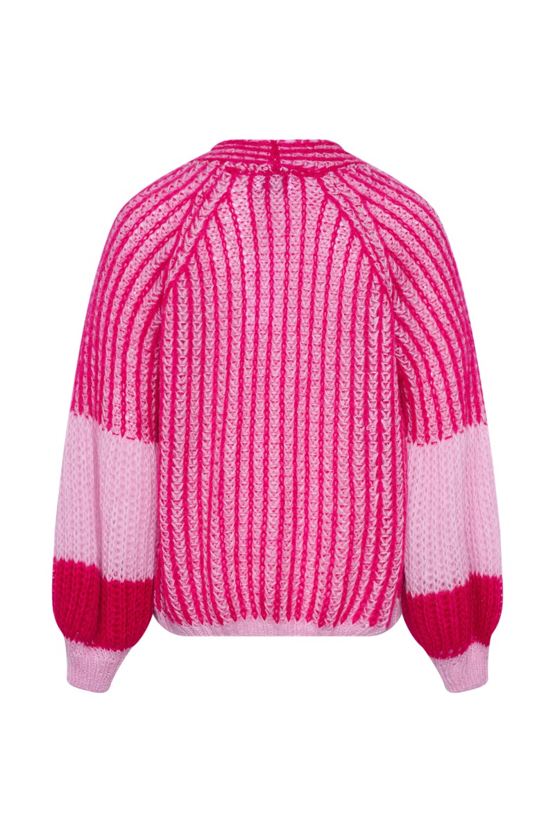 Noella cardigan i lyserød med pink mønster. Cardiganen er lavet i en let strikkvalitet i en rummelig pasform med en vig udskæring. De lange ærmer afsluttes med en bred balloneffekt i bunden og er super skøn til de kolde efterårsdage.