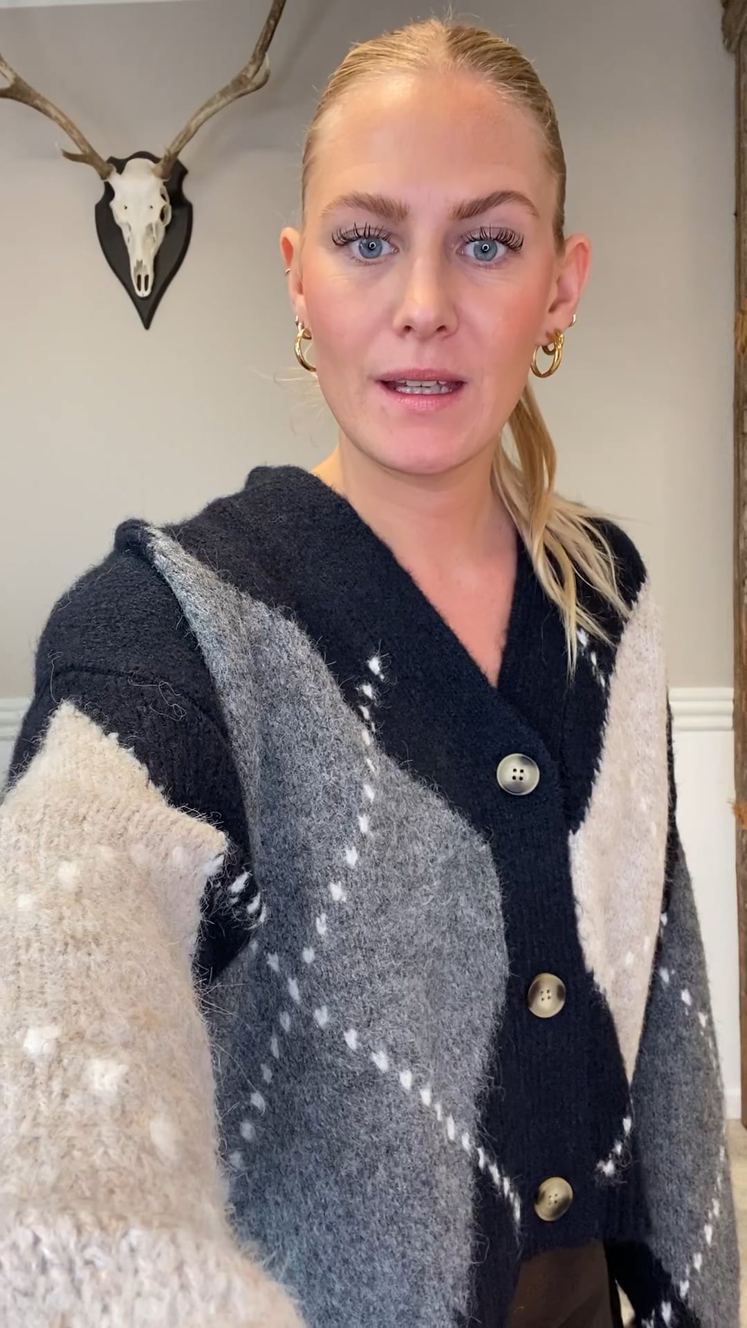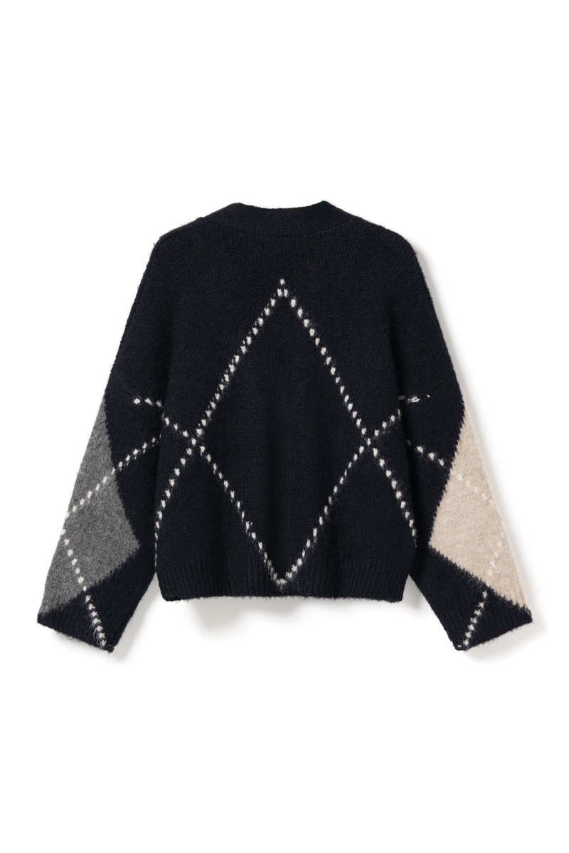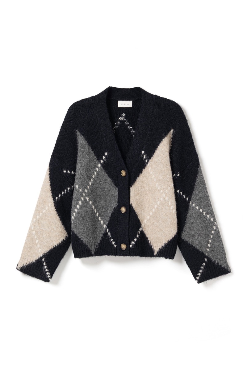 Denne cardigan har et klassisk argyle-mønster i navy, grå og beige nuancer, som giver et tidløst og elegant udtryk. Den er strikket i et blødt og fluffy materiale, der ser varmt og behageligt ud. Modellen er let cropped med en dyb V-udskæring og lukkes med tre knapper på fronten. De brede ærmer og den afslappede pasform giver et moderne, cozy look. En perfekt cardigan til både hverdagsbrug og lag-på-lag outfits.