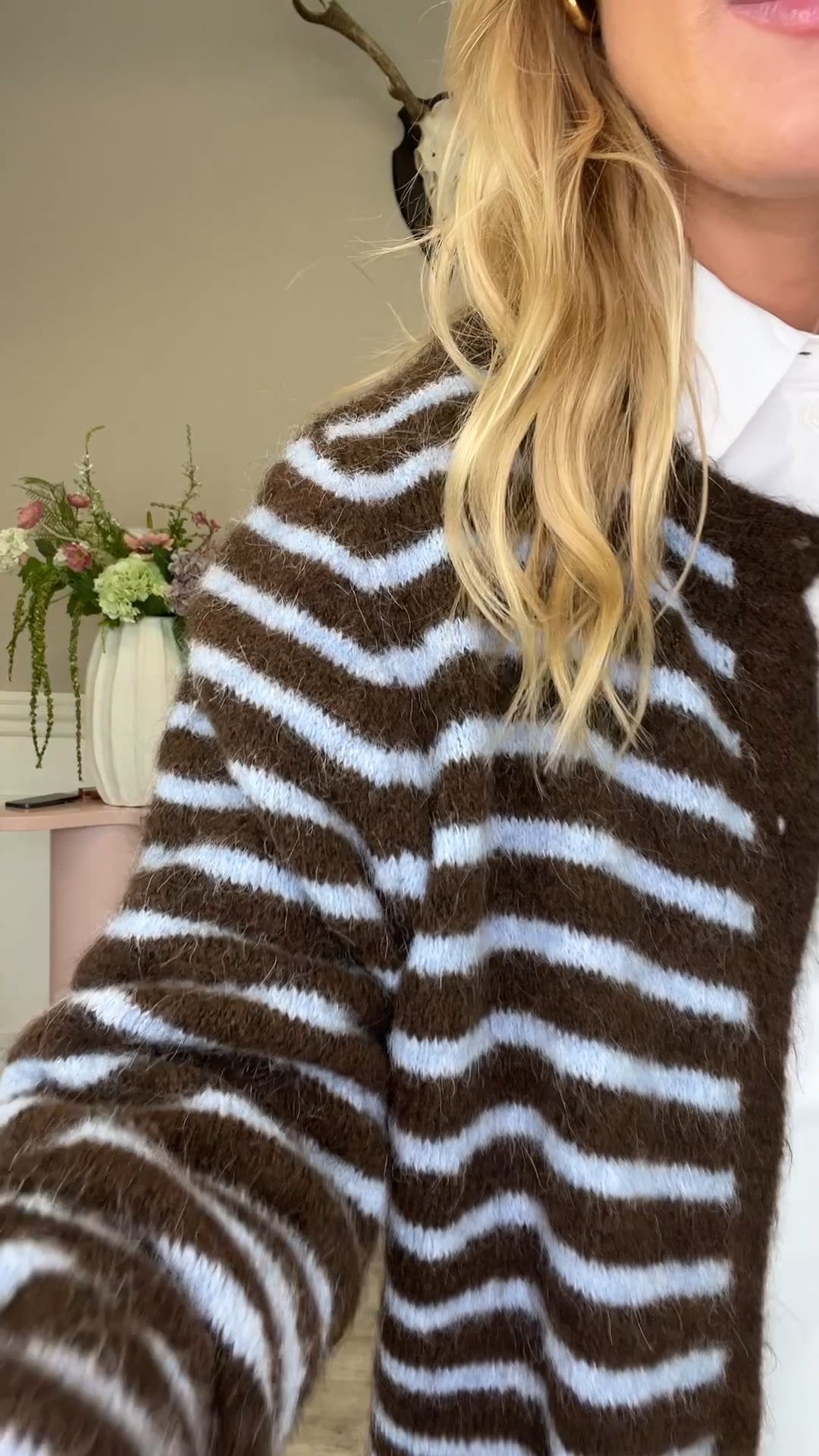Cardiganen har et blødt og hyggeligt udtryk med smalle vandrette striber i brun og lyseblå, som giver et roligt men moderne look. Materialet virker let loddet og fluffy, hvilket tilfører varme og komfort. Den har rund hals, gennemgående knaplukning foran og lange ærmer med ribkanter ved håndled og bund. Pasformen fremstår afslappet og en smule kort i længden, hvilket gør den nem at style lag-på-lag. Samlet er det en feminin og casual strik, der passer godt til både jeans, nederdele og kjoler.