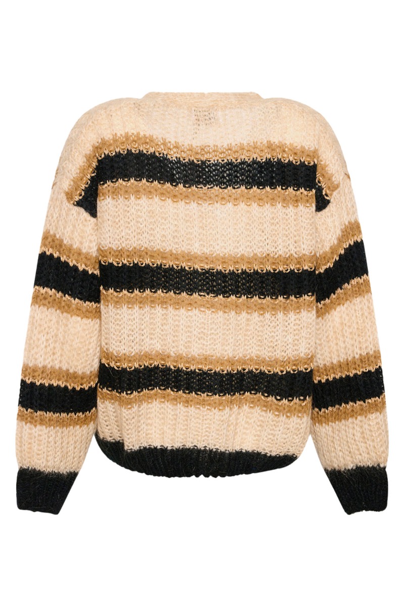 En dejlig hyggelig cardigan fra Noella i en blød let strik kvalitet. Cardiganen lukkes foran ved v-udskæringen med synlige knapper foran. Den er stribet i brune nuancer med guld glimmer detaljer der giver en feminin effekt. Style den til dine kjoler eller jeans.