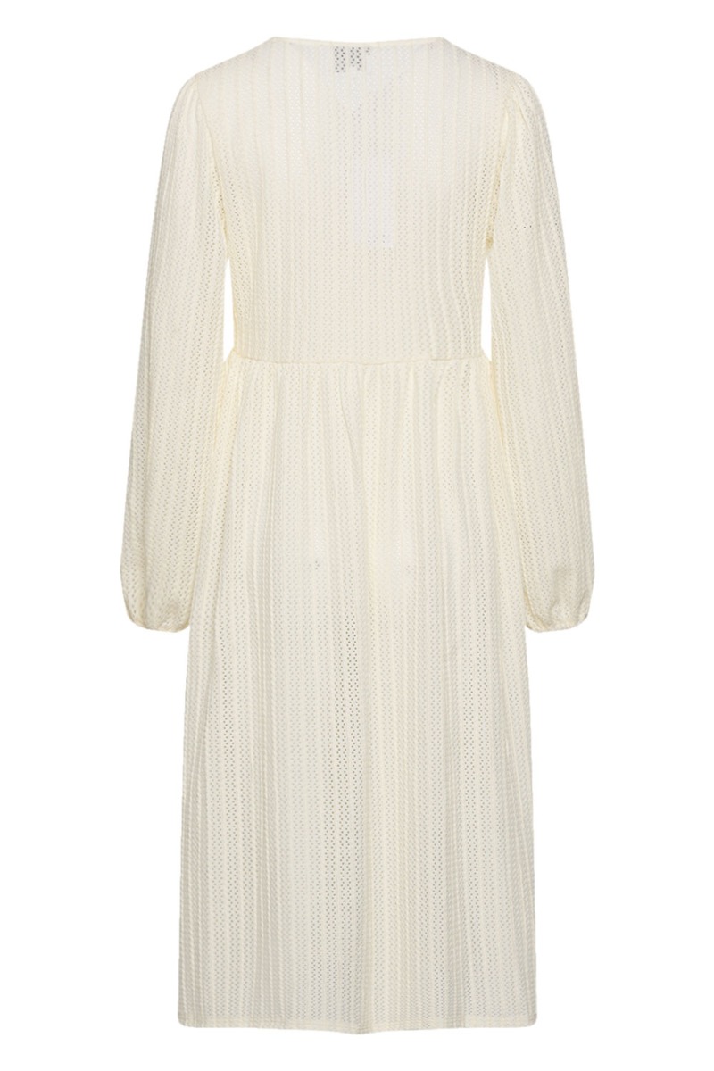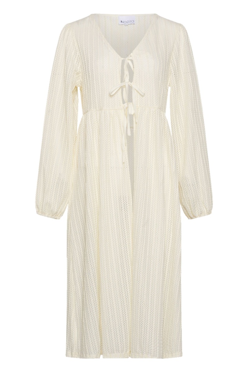 En smuk kjole eller cardigan fra Noella. Det er svært at bestemme sig for hvad det er, men den kan bruges til begge dele. Det er en åben kjole som man bruger et par tights til under eller måske den matchende bukser. Den har sløjfedetlajer foran og lange ærmer med en smule balloneffekt.
