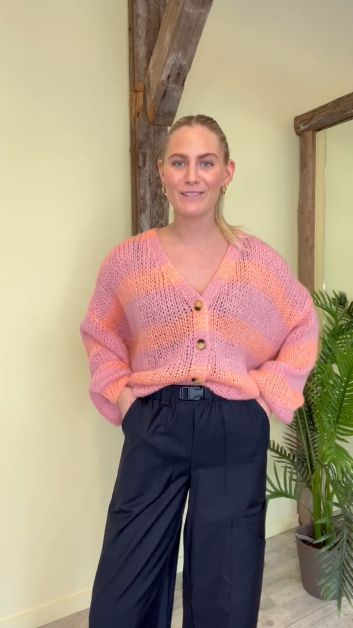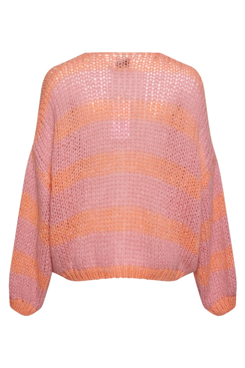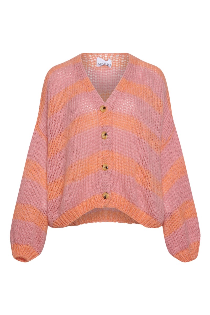 En sød strikket cardigan fra Noella i stribet mønster i rosa og coral. Cardiganen er lavet i en dejlig let og blød kvalitet der er perfekt her til foråret. Den lukkes foran ved v-udskæringen med knapper hele vejen ned og har løse ærmer der går ind ved håndleddet. Style den til et par jeans eller nederdel.