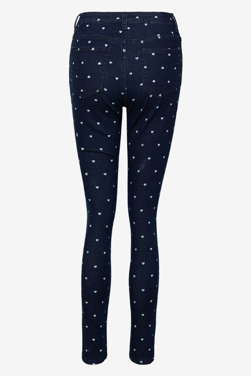 Sejeste denim jeans med små hvide hjerter fra Noella. De har et tætsiddende jeans design med en klassisk knaplukning foran. Bukserne har både lommer foran og bagpå. De har en lækker pasform i et super elastisk design.