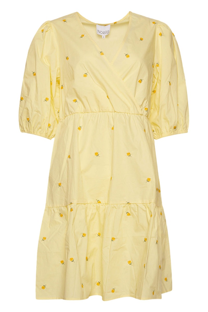 En skøn kjole fra Noella i en smuk gul farve. Kjolen har pufærmer og er A formet i bunden. Derudover er der broderet små gule roser på hele kjolen og giver et dejlig sommerligt udtryk. Kjolen har en smule peplum effekt i bunden og har denne slå-om detalje ved brystet. Dette vil sige at den er syet fast så den ikke kan åben sig men heller ikke kan strammes ind. Den findes også i rosa.