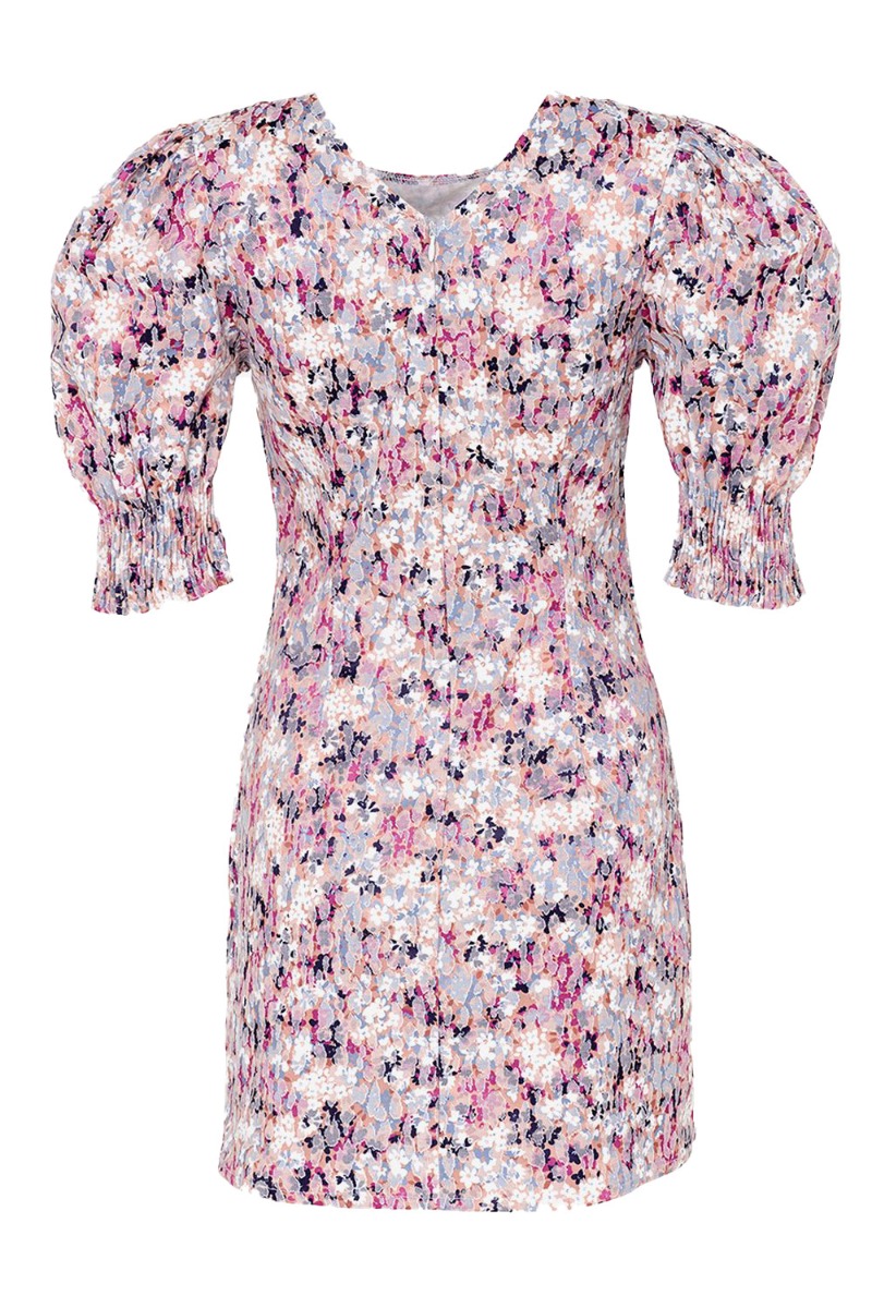 Den smukkeste kjole fra Noella med et lyst blomsterprint i blå, lilla og nude nuancer. Kjolen er tætsiddende der går ind i livet og skaber den smukkeste timeglasfigur. De korte ærmer afsluttes med en bred smock der skaber et ballon-snit. Bagpå går den ned i en fin v-udskæring der lukkes med lynlås.
