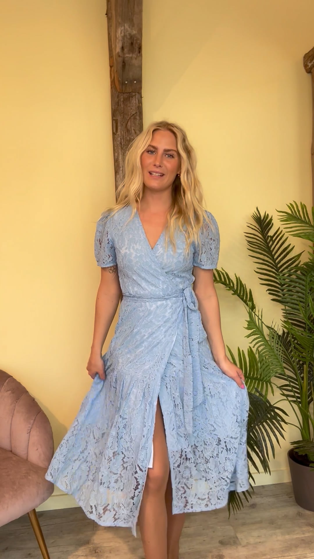 Se nu lige den smukkeste blonde kjole fra Noella. Kjolen er i en feminin pasform med bindebånd og slå-om der bindes i siden. Kjolen har korte pufærmer med elastik i enden. Den er foret indvendigt så den ikke bliver gennemsigtig.