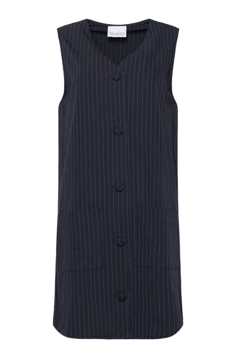 En cool spencerkjole fra Noella i navy med tynde nålestribet mønster. Kjolen er designet i et let materiale der har lidt et blazer lignende udtryk. Foran lukkes den med stofbetrukket knapper og er super cool over en skjorte, t-shirt eller sweat.
