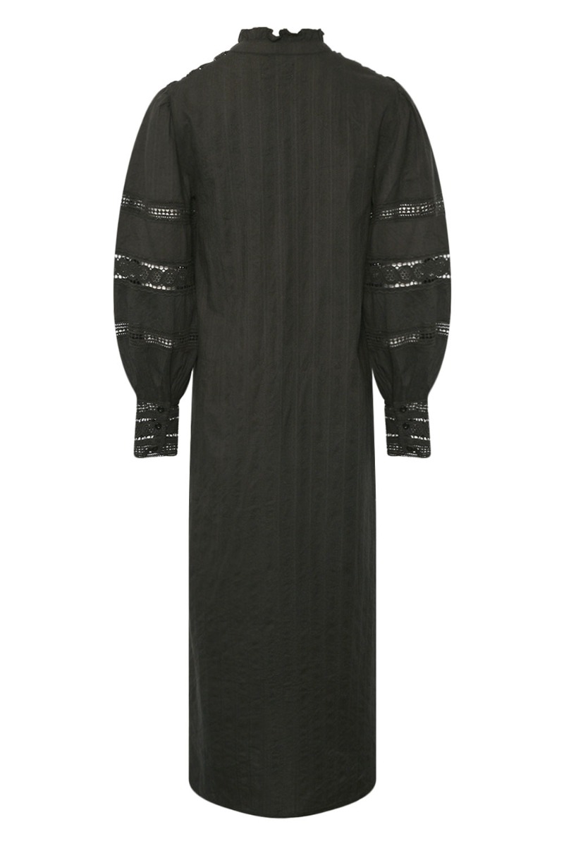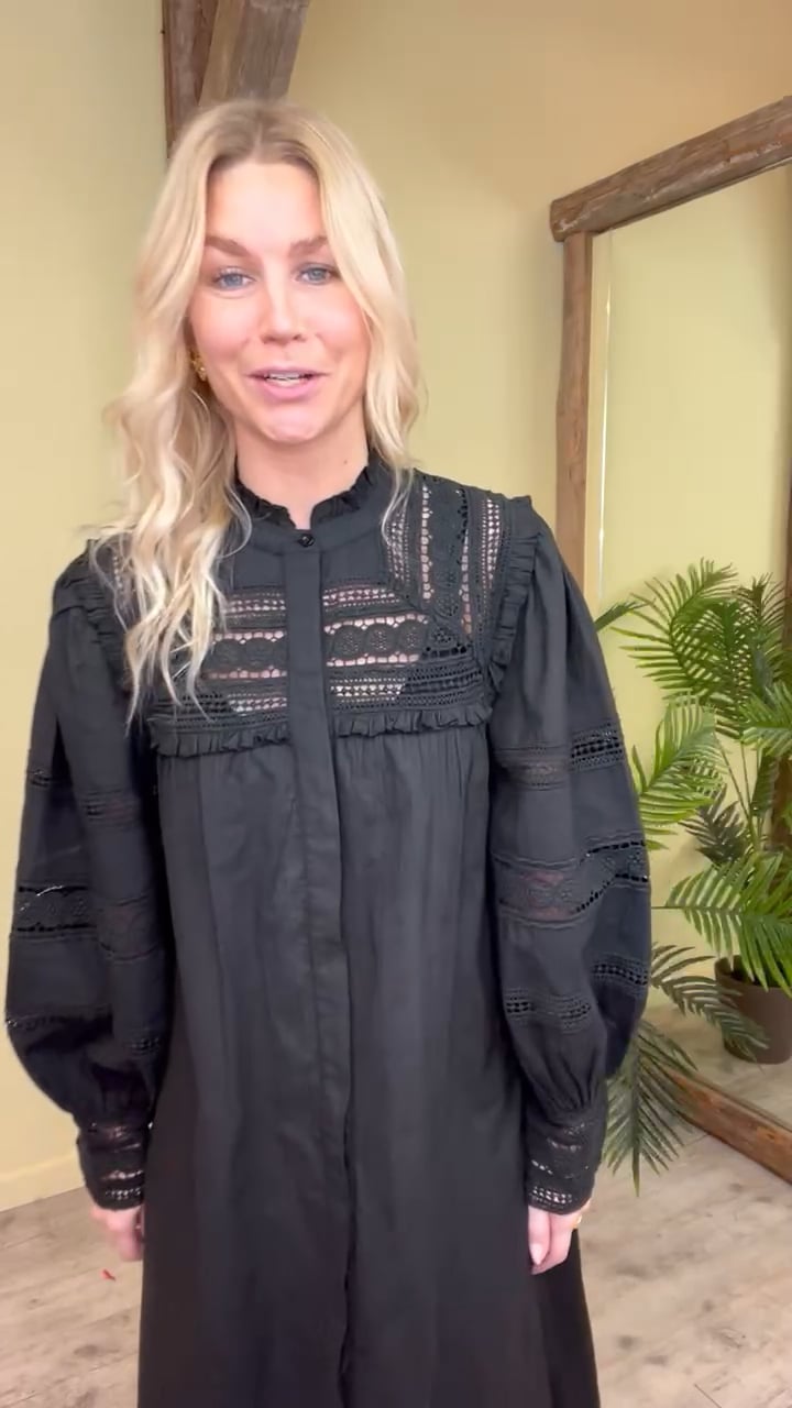 Den er så fin denne kjole med smukke blonde detaljer ved brystet fra Noella. Den er løs i pasformen og har knapper hele vejen ned. Den brede ærmer afsluttes med den samme blondekant. Den findes også i hvid.