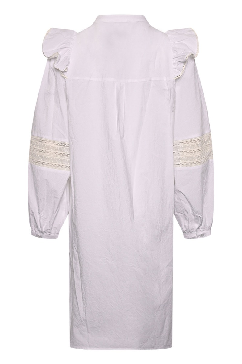 En sød kjole i hvid fra Noella i en løs pasform. Den har flæse ved brystet som danner en V form. Den har derudover ballonærmer som har en fin blonde detalje. Den er ammevenlig og findes i flere farver.