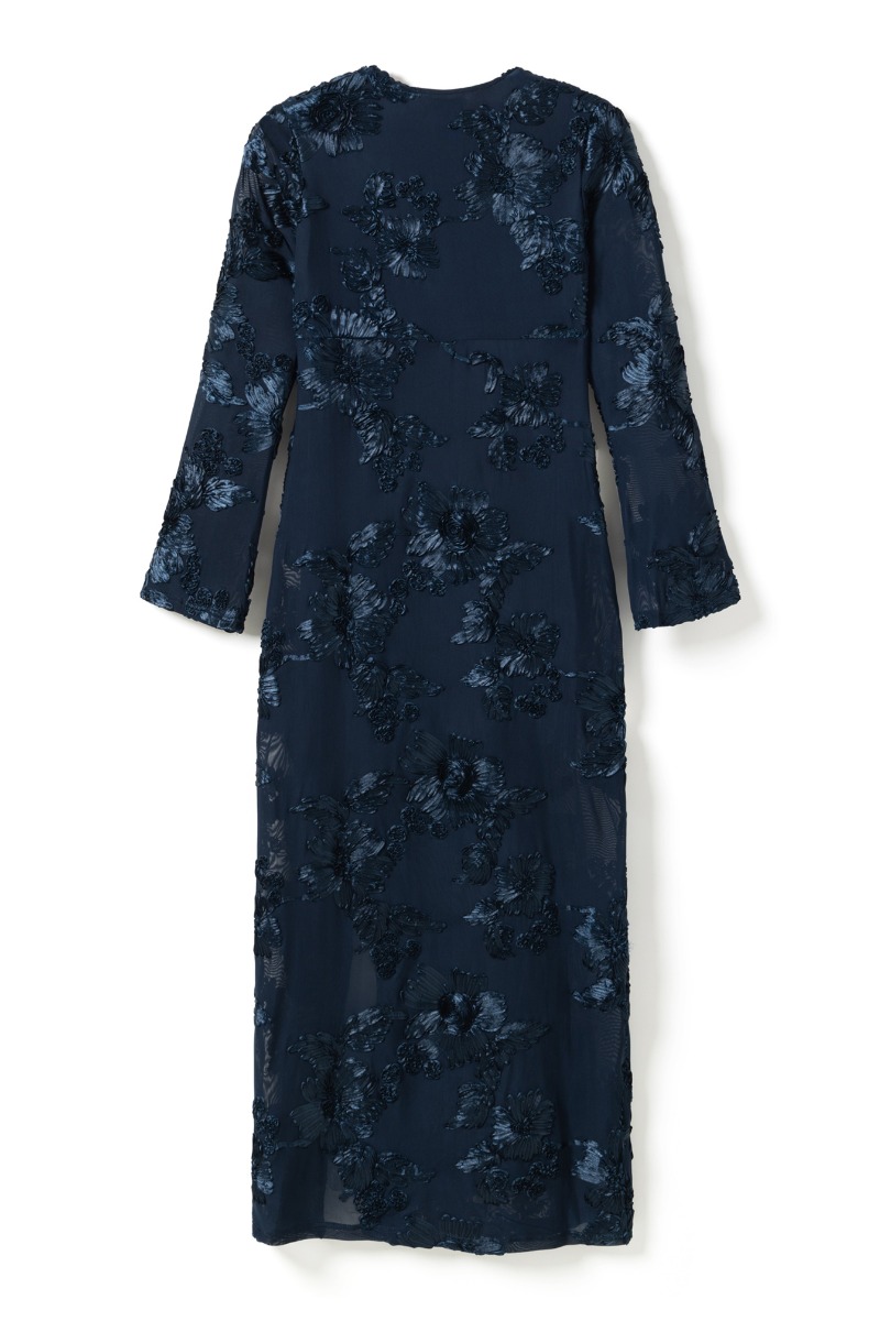 Fineste kjole fra Noella lavet i rigtigt fint materiale med struktur, som giver kjolen liv. Kjolen er i en smuk mørk navy farve og ejner sig perfekt til efteråret og vinterens festligheder. Kjolen går ned i V-hals og har et slids. Ærmerne er dejlig løse og går en smule ud i trompetærmer.