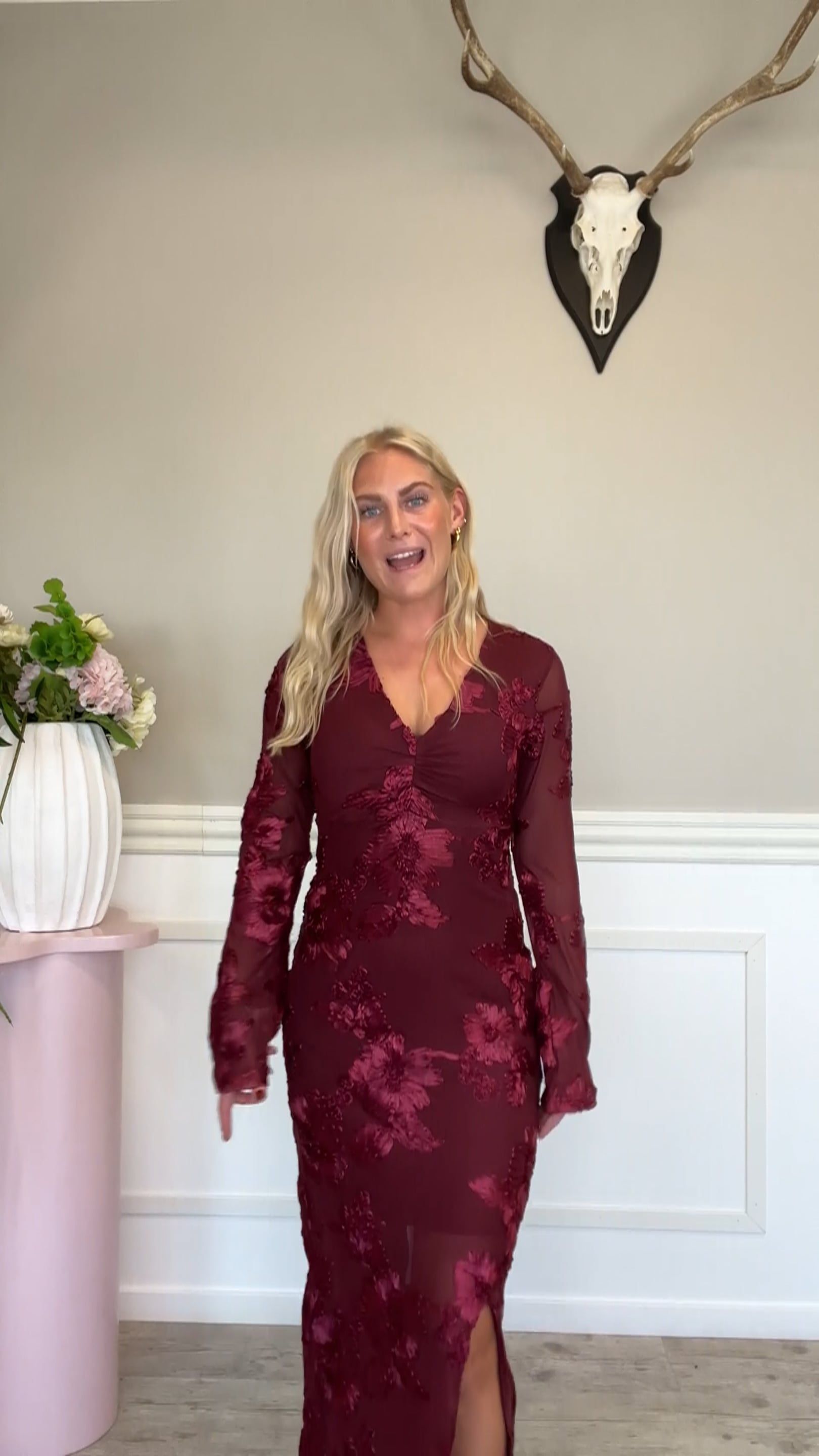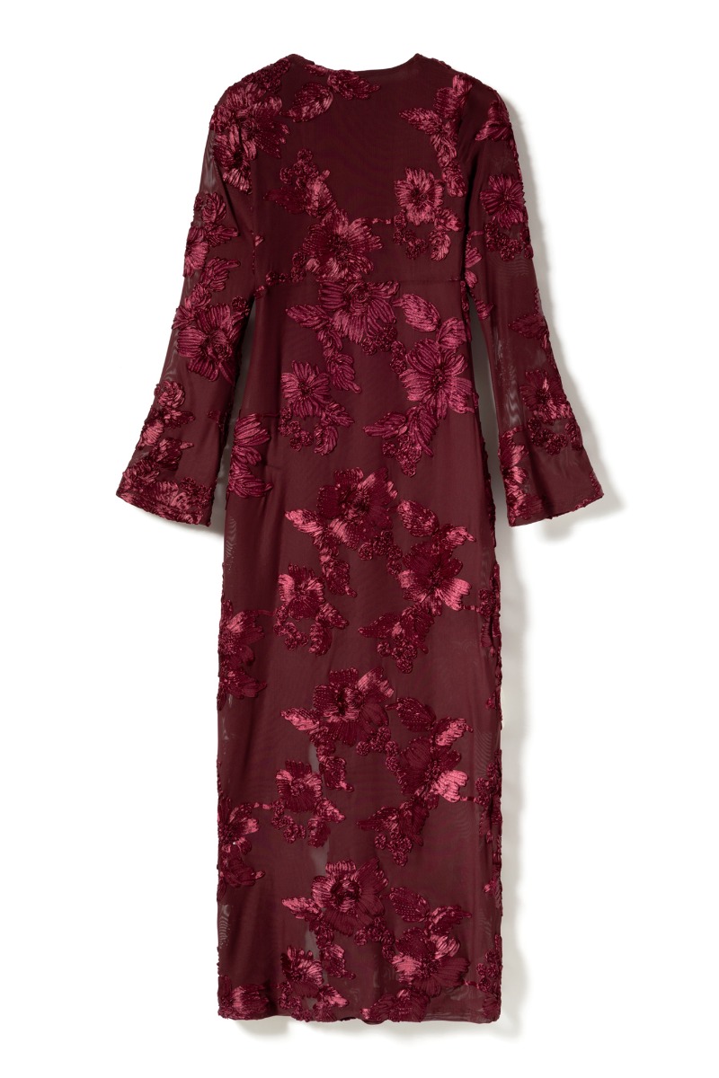 En sød kjole fra Noella er kommet i denne smukke vin-røde farve. Den er med strutkur i stoffet og falder smukt på kroppen. Den har slids foran og lange ærmer som går en smule ud i trompetærmer. Kjolen ville være den perfekte julefrokost kjole.