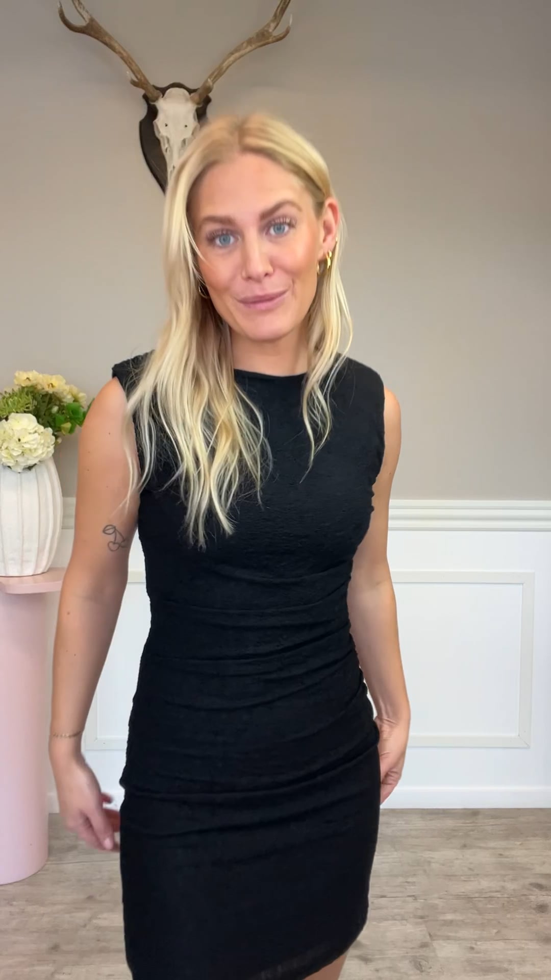 Smuk og simpel sort kjole fra Noella! Kjolen er i blonde look og er perfekt til sæsonens fester, den kan let styles til et par strømpebukser og en stilet!