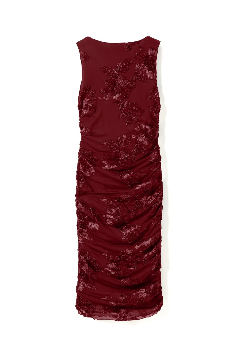 Den smukkeste kjole fra Noella der er oplagt til de kommende fester i en smuk bordeaux farve med blomster i bordeaux. Kjolen er tætsiddende i et stretchy materiale. Den sidder virkelig spot-on og er med rynkedetalje i siderne. Style den med en stilet.