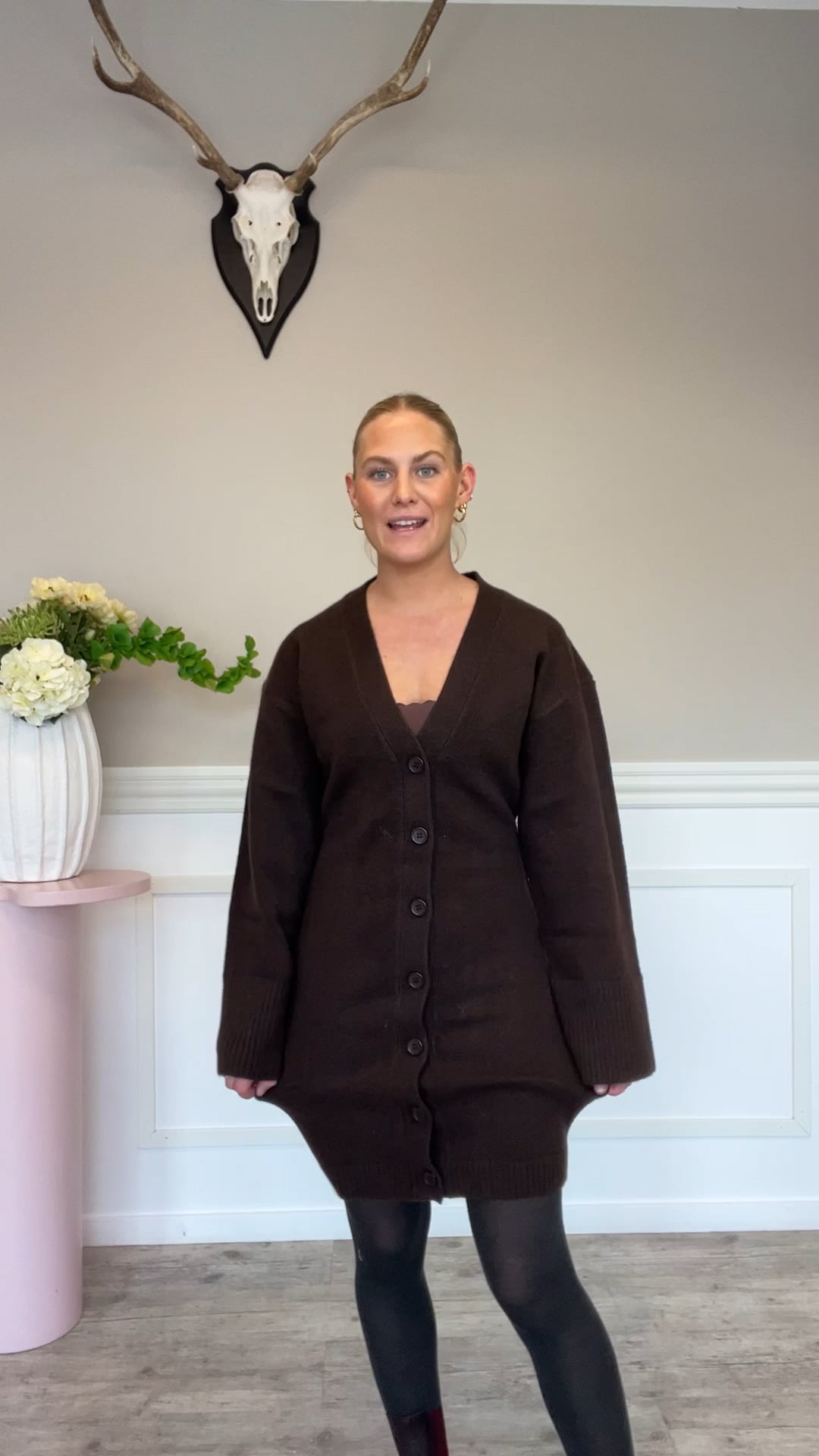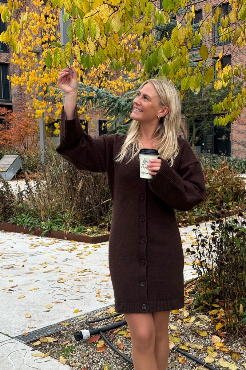 Lækker strik kjole i brun er landte fra Noella! Kjolen er helt perfekt til efterårs vejret. Den har lange ærmer og er super behaglig at have på. Den kan let styles til et par strømpebukser og et par fede støvler, for et super cool look!