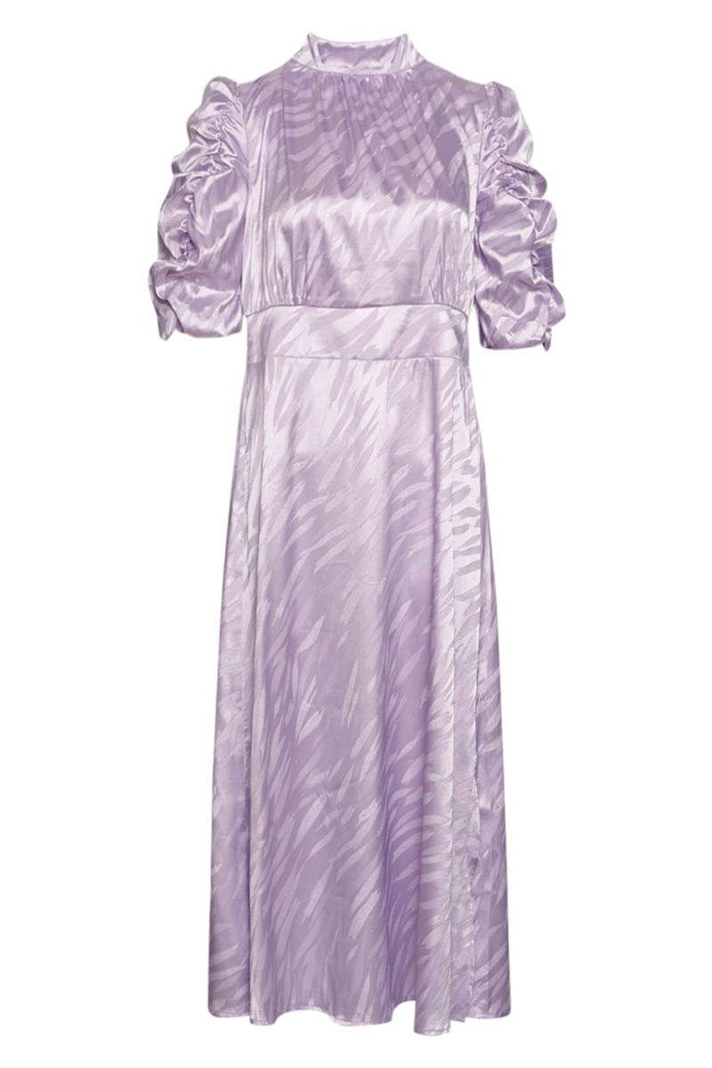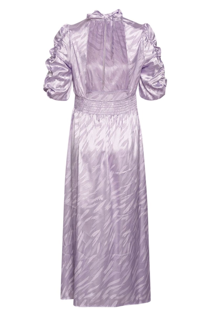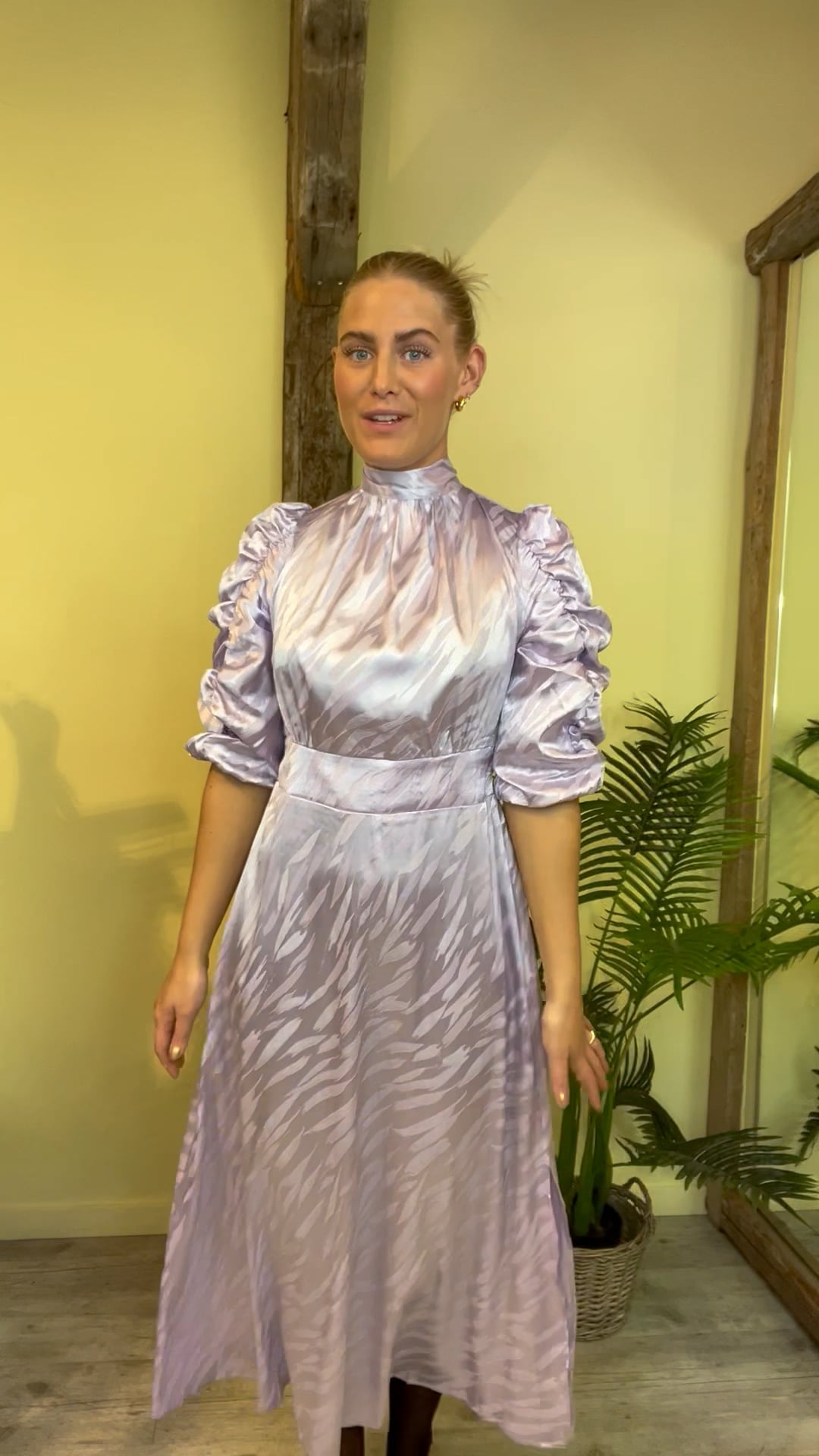 Den fineste kjole er kommet fra Noella i en lys lilla satin kvalitet med mønster i stoffet. Den har åben ryg og bindes i nakken med en sløjfe. Den er løs i både under- og overdel men sidder tæt i taljen hvor der er smock effekt bagpå. Den kan bruges med en strik over eller til en stilet.