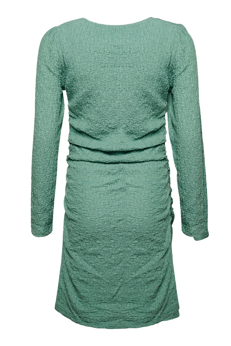 En sød enkel kjole fra Noella i mint farvet der kan bruges både med og uden en babybule. Kjolen er tætsiddende i krølstof med rynkedetalje i siderne og stretch hvilket gør den ikke sætter sig ind nogle steder. Den har lange ærmer og rund hals. En kjole der kan bruges både til hverdag og fest.