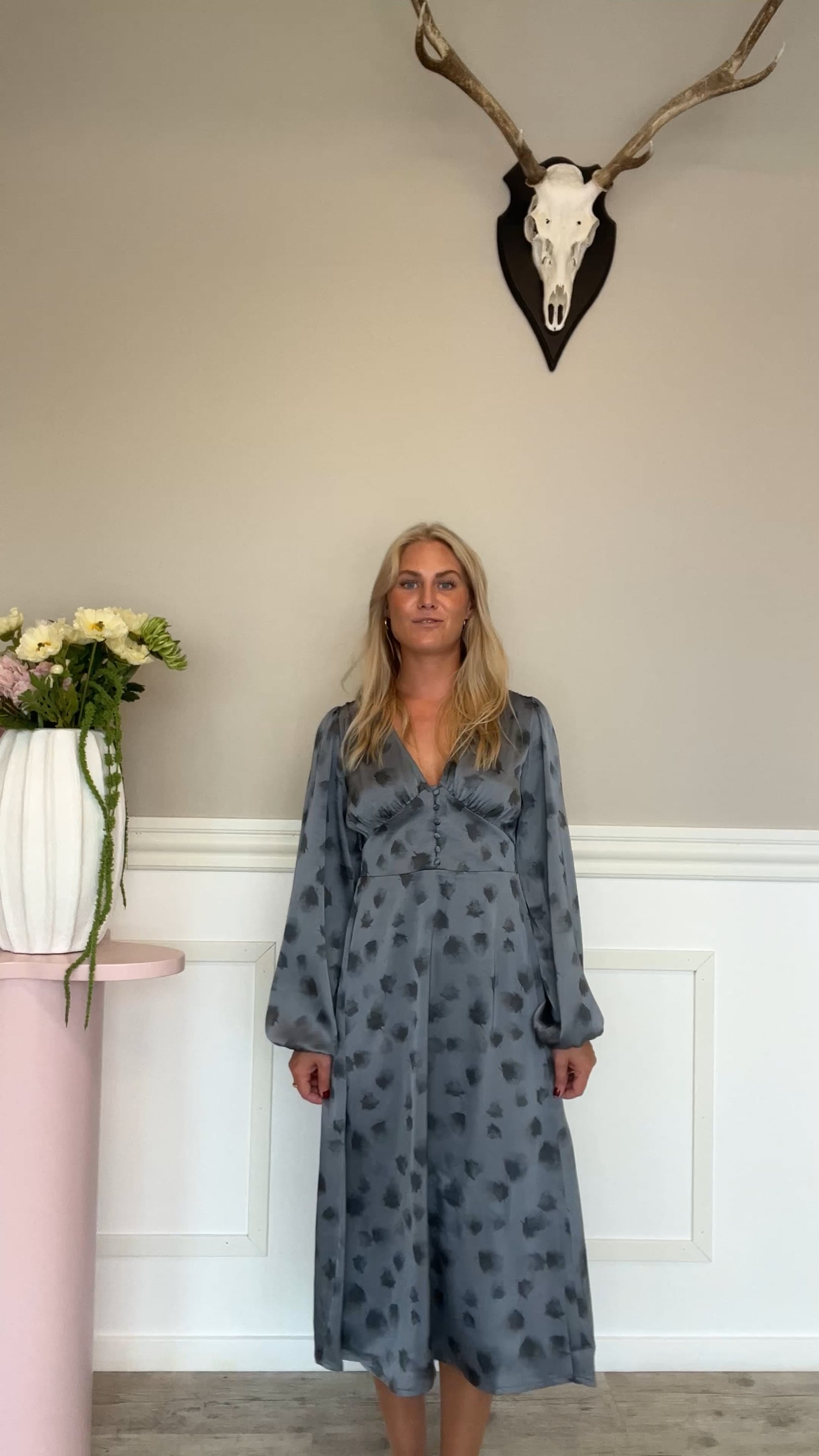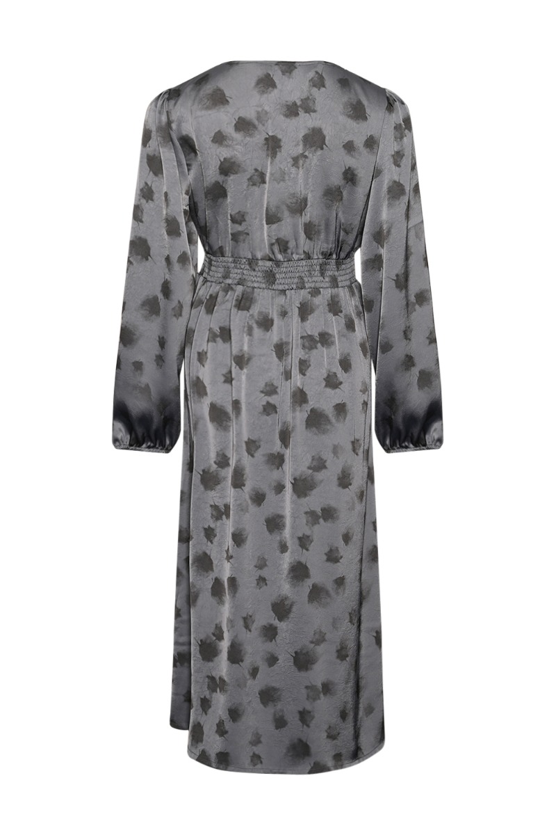 En helt utroligt fin kjole er landet fra Noella i den fineste støvede blå farve og med flotte efterårsagtige blade på. Kjolen her samles i livet med en række knapper, som munder ud i en v-udskæring. Den har et lille stykke smock bagpå, så den samtidig er super behagelig at have på.