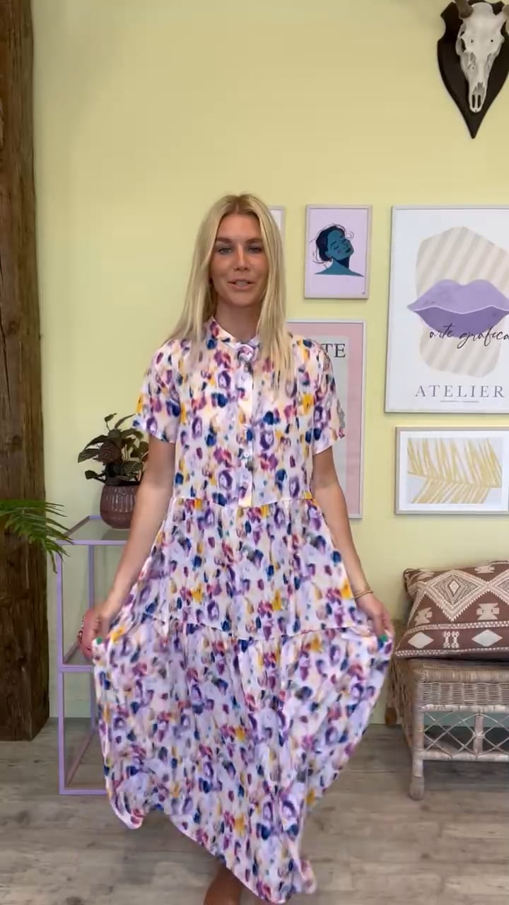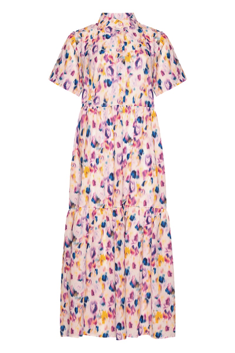 En rigtig sød sommerkjole fra Noella der er lavet i en let og luftig kvalitet. Kjolen har et taknemmeligt snit der klæder de fleste kropstyper! Bundfarven er lys rpsa med det fineste grafiske print i lilla, blå og gule nuancer. Kjolen knappes ned til livet og giver en sød tre-delt-effekt med peplum og korte t-shirtærmer. Style den med en stilet eller sneaks alt efter humør!
