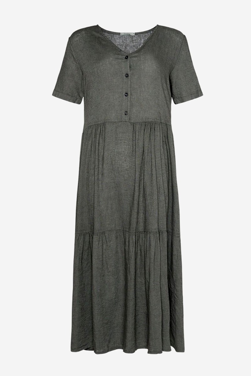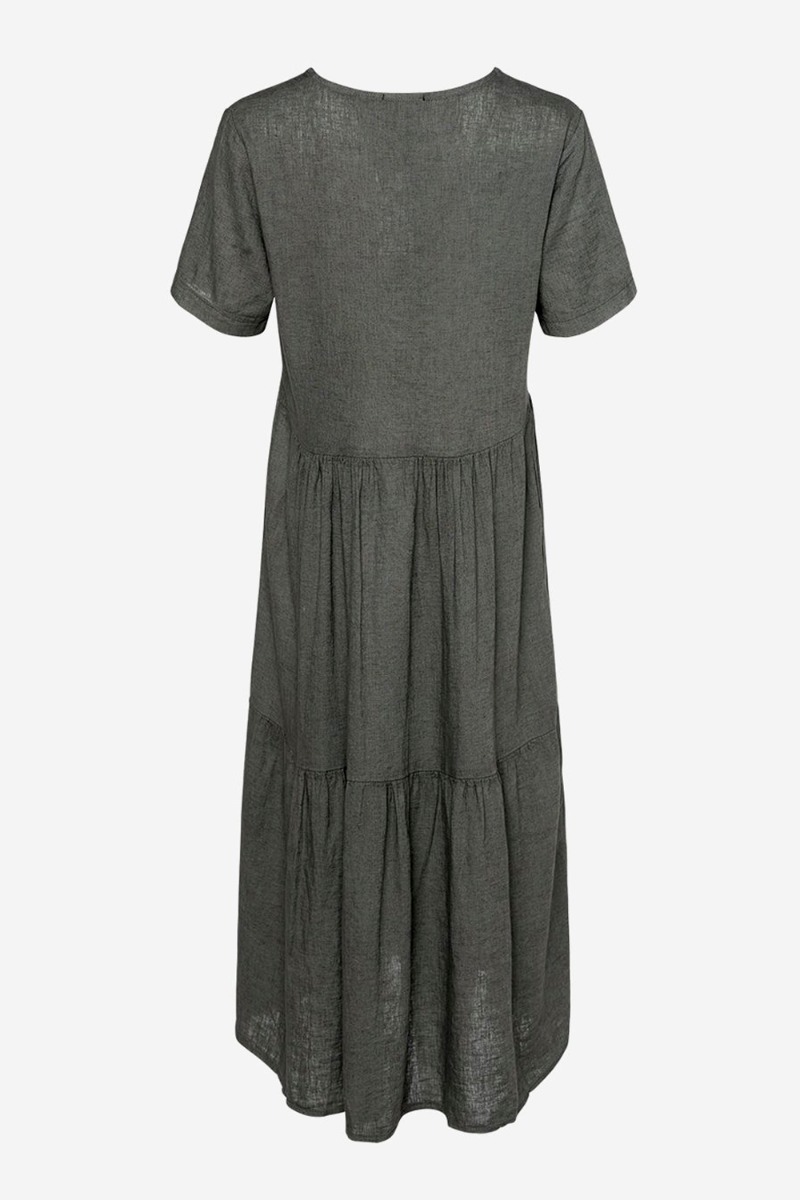 Skøn mørkegrå kjole i blød hørkvalitet fra Noella. Kjolen har V-udskræing og knappes foran. Der er peplumskørt og kjolen har korte ærmer.