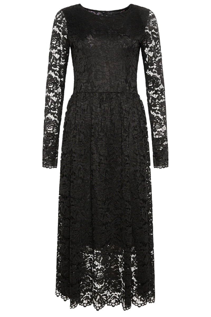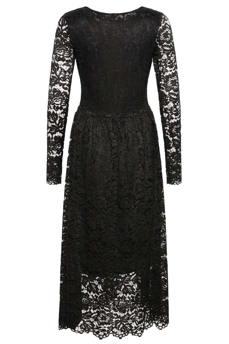 Sort lang blondekjole fra Noella. Den er lavet i et transparent ydermateriale og derfor er den foret med en sort underkjole. I taljen har den en tydelig syning som giver kjolen en flot figur. Derudover er den designet med rund halsudskæring og lange tætsiddende ærmer.