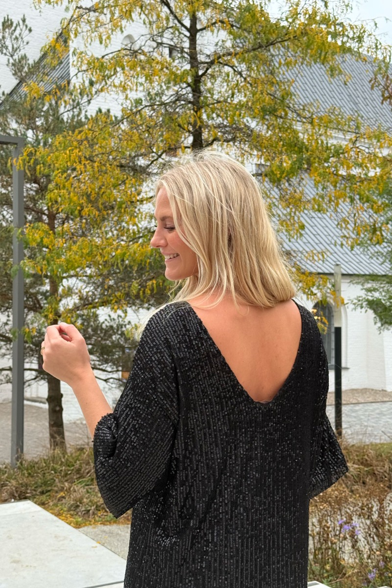 En utrolig smuk paillet kjole fra Noella der er oplagt til alle festerne denne sæson. Kjolen har et løst a-snit med v-udskæring bagtil der giver et feminint udtryk. Kjolen har et t-shirtærme så du ikke føler dig bar og er super smuk med en lang støvle eller lille fin stilet alt efter hvilket udtryk du ønsker.
