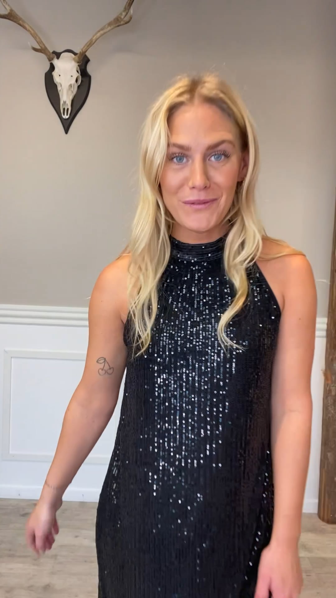 Denne sorte kjole fra Noella udstråler elegance og festlig glamour med sit skinnende, let transparente stof dækket af fine pailletter. Kjolen har en løs, A-formet silhuet, der falder smukt omkring kroppen og giver et luftigt, ubesværet udtryk. Den høje halsskæring og ærmeløse design tilføjer et moderne og sofistikeret præg, mens længden til lige over knæet gør den ideel til både festlige begivenheder og særlige aftener. Stylet med høje støvler, som her, får looket et cool og tidsløst udtryk, men den kan også bæres med stiletter for en mere klassisk og feminin fremtoning.