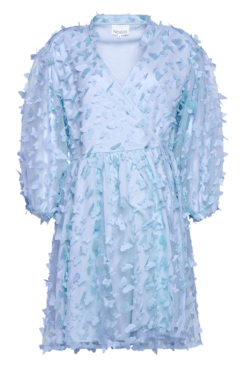 Smukkeste kjole fra Noella med små fine sommerfugle, der nærmest giver kjole en cool 3D-effekt. Super fin sommerkjole, som er helt perfekt til alle de skønne fester, vi skal til i løbet af foråret og sommeren! Kjolen er med slå-om-effekt, der spændes med en indvendig knap.