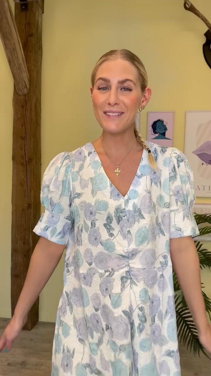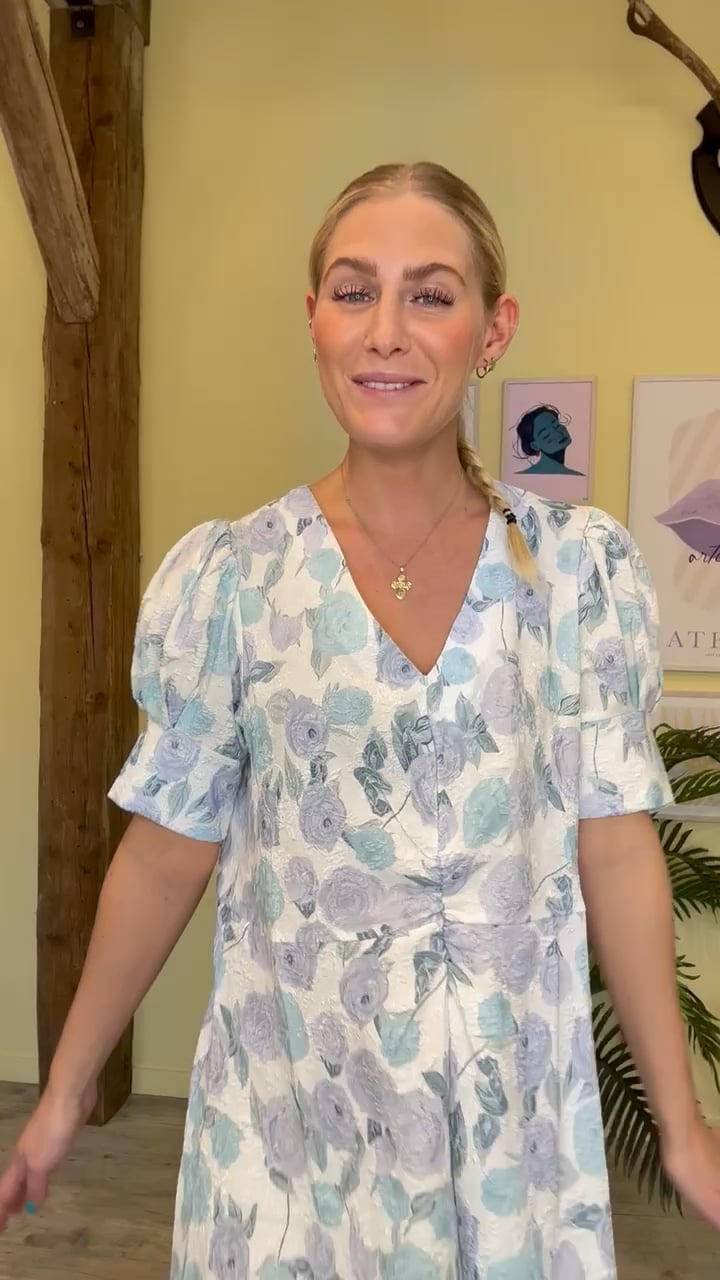 Flotteste kjole fra Noella i det fineste blomsterprint i lilla og blå på en hvid baggrund. Kjolen har talje med rynkeeffekt ved brystet der giver en virkelig smuk pasform og falder utrolig flot. Ærmerne har en bred kant i bunden der skaber et lille puffet udtryk. Denne kjole egner sig helt sikkert til forår og sommerbryllupperne med en stilet.
