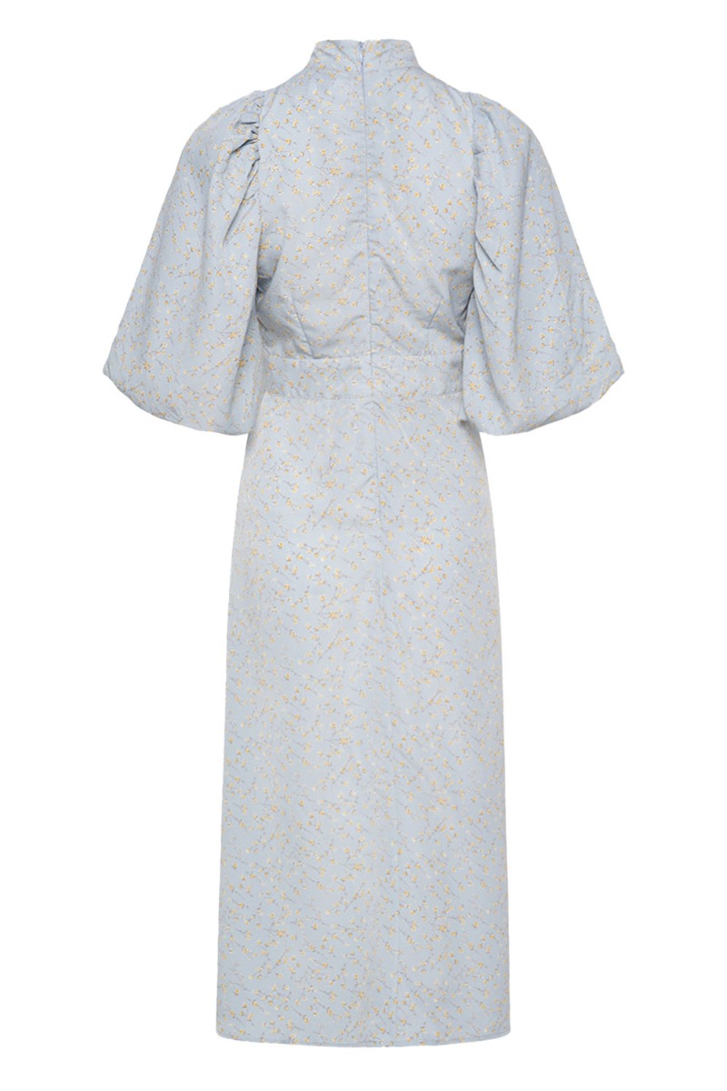 Fineste kjole fra Noella der er oplagt til de mange sommerfester. Kjolen har den skønneste pasform med et synligt stykke ved livet der giver en feminin talje. Den falder flot løst med volumiøse ærmer og lynes bagtil. Bundfarven er blå med et fint lille blomsterprint i gule farver.