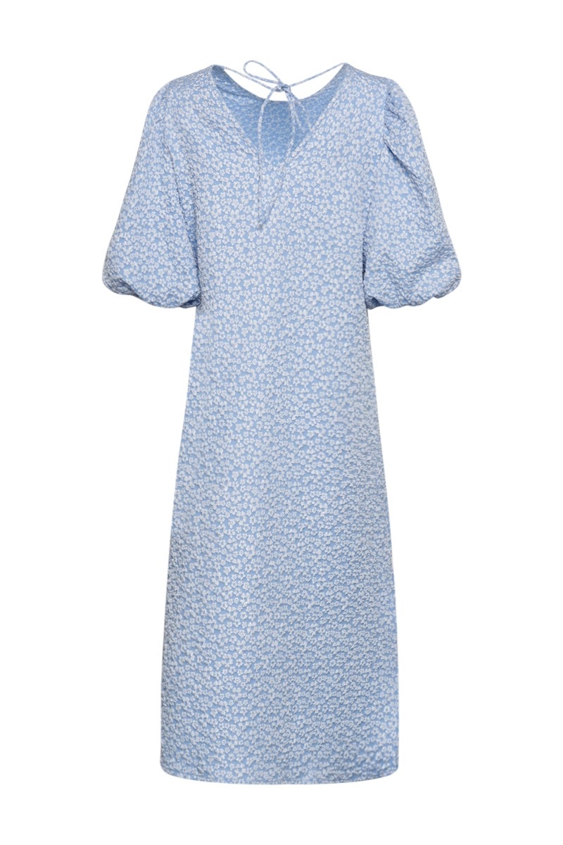 Den flotteste kjole fra Noella! Kjolen er med et fint blomster mønster i stoffet, som virkelig giver kjolen et feminint look. Derudover går kjolen ud i et A-snit og har fine puffærmer. Den bindes i nakken med en sløjfedetalje og går ned i et v. En smuk sommerkjole som kan bruges til de mange festligheder!