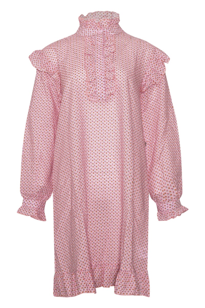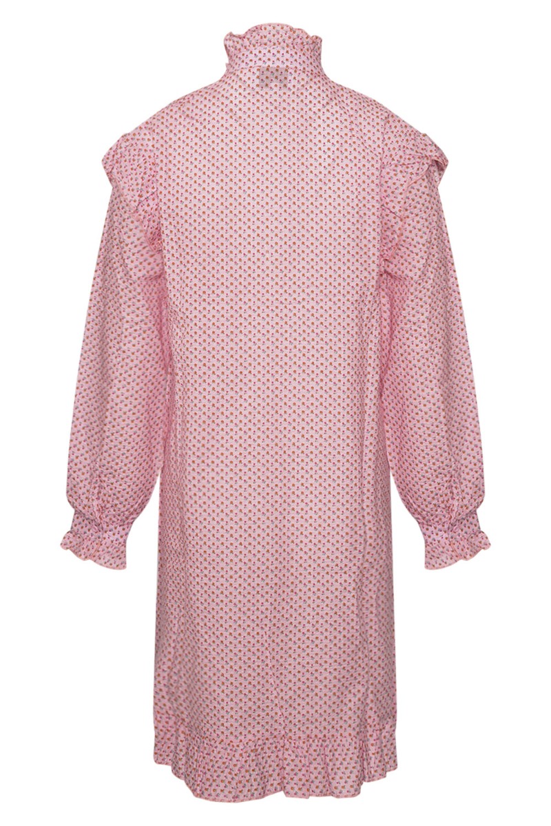 Den fineste kjole nyhed fra Noella! Kjolen er lyserød med et sødt blomsterprint på. Den er med flæsedealjer og knapper ved halsen og har en løs pasform. Det fine print findes også i en bluse.