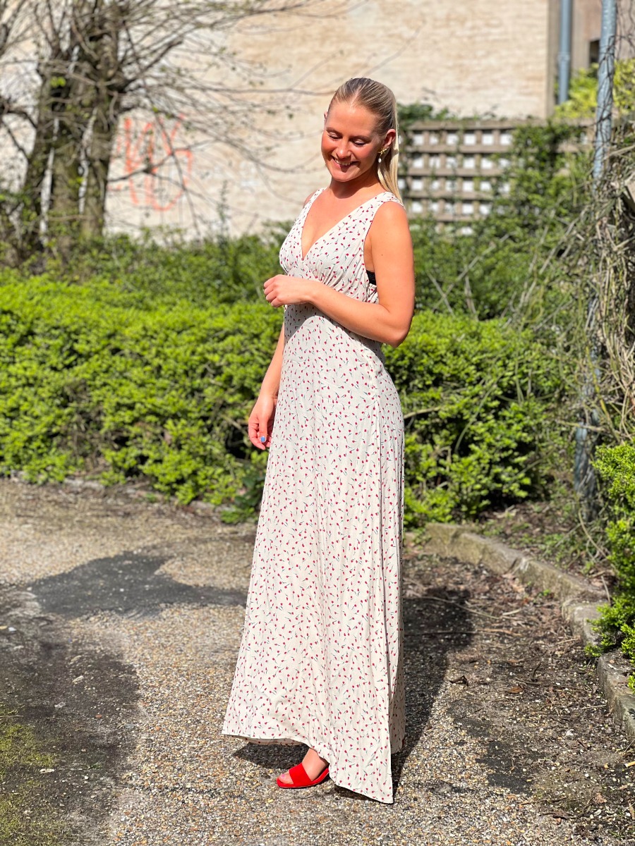 En fin kjole fra Noella er kommet i en beige farve med små røde blomsterprintet på. Den er med V udskæring og har lynlås i siden så den er nem at komme i. Den er løs i underdelen og og en smule gennemsigtig, derfor anbefaler vi at du bruge en underkjole under.