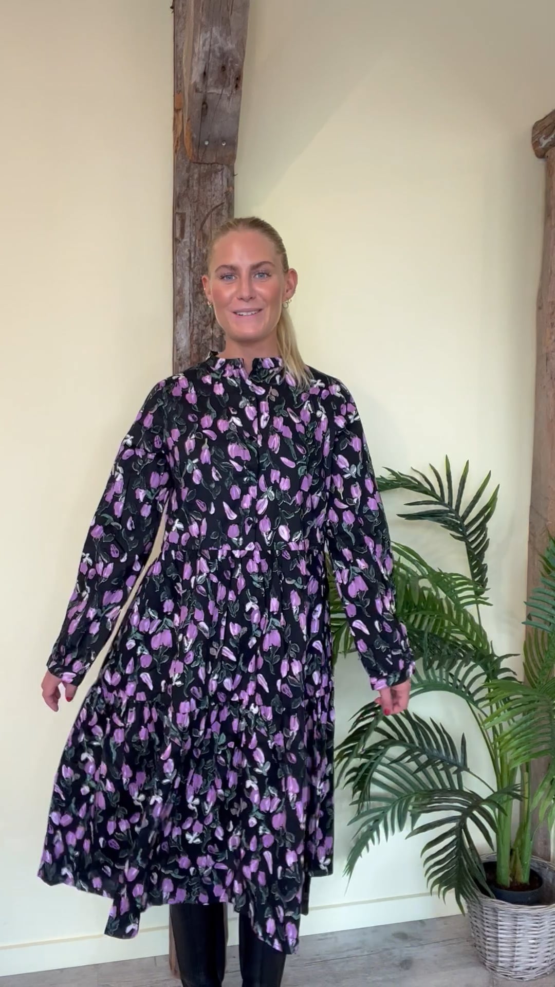 Den fineste kjole fra Noella i en længere model. Kjolen er med dobbelt peblum forneden og har knapper ned til taljen, hvilket også gør den ammevenlig. Kjolen er med sort bundfarve og er med lilla og grønne blomster på. En kjole som du både kan style til hverdag og fest!