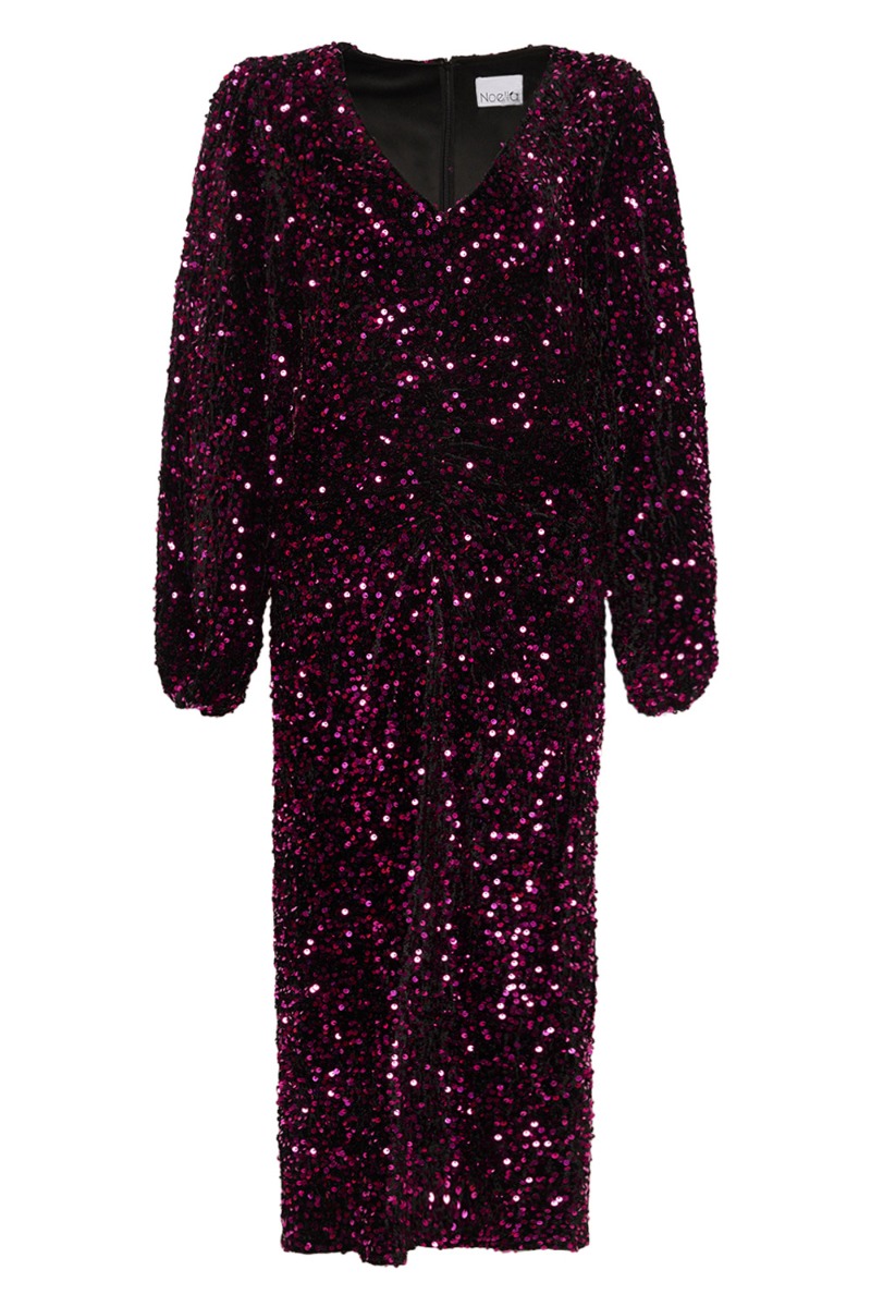 Den flotteste kjole fra Noella i sort farve og med de fineste palietter i lilla nuancer. Kjolen er oplagt til jul og nytår og oser af party. Den er tætsiddende uden at føles stram. Der er V-udskæring foran samt en flot slids foran på den nederste del af kjolen. Lukkes og åbnes på ryggen med lynlås.