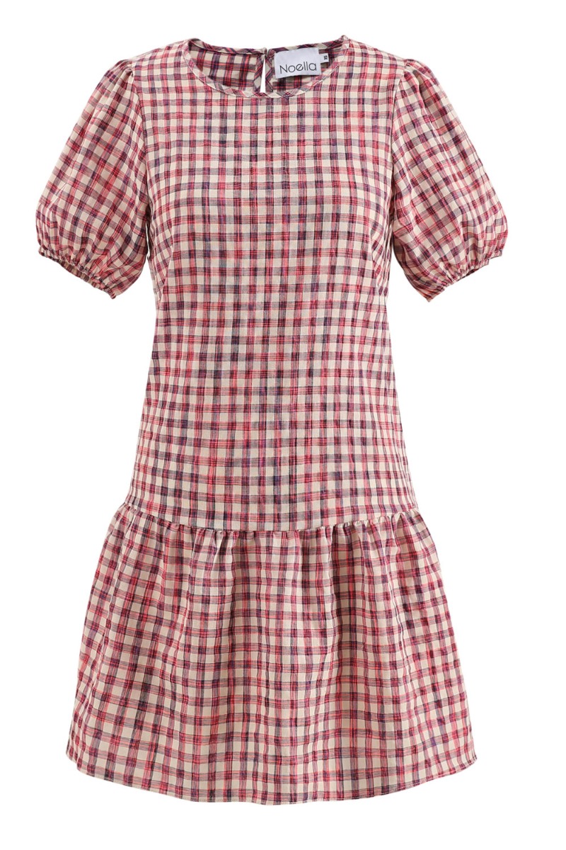 Super fin ternet kjole fra Noella. Bundfarven er brund med et ternet print i pink og blå nuancer. Kjolen er rummelig med peplum i bunden og lukkes i nakken med knaplukning. De korte t-shirtærmer afsluttes med elastikdetalje der giver et fint lille ballon-snit. Style den til hverdag med en sneaks eller sandal.