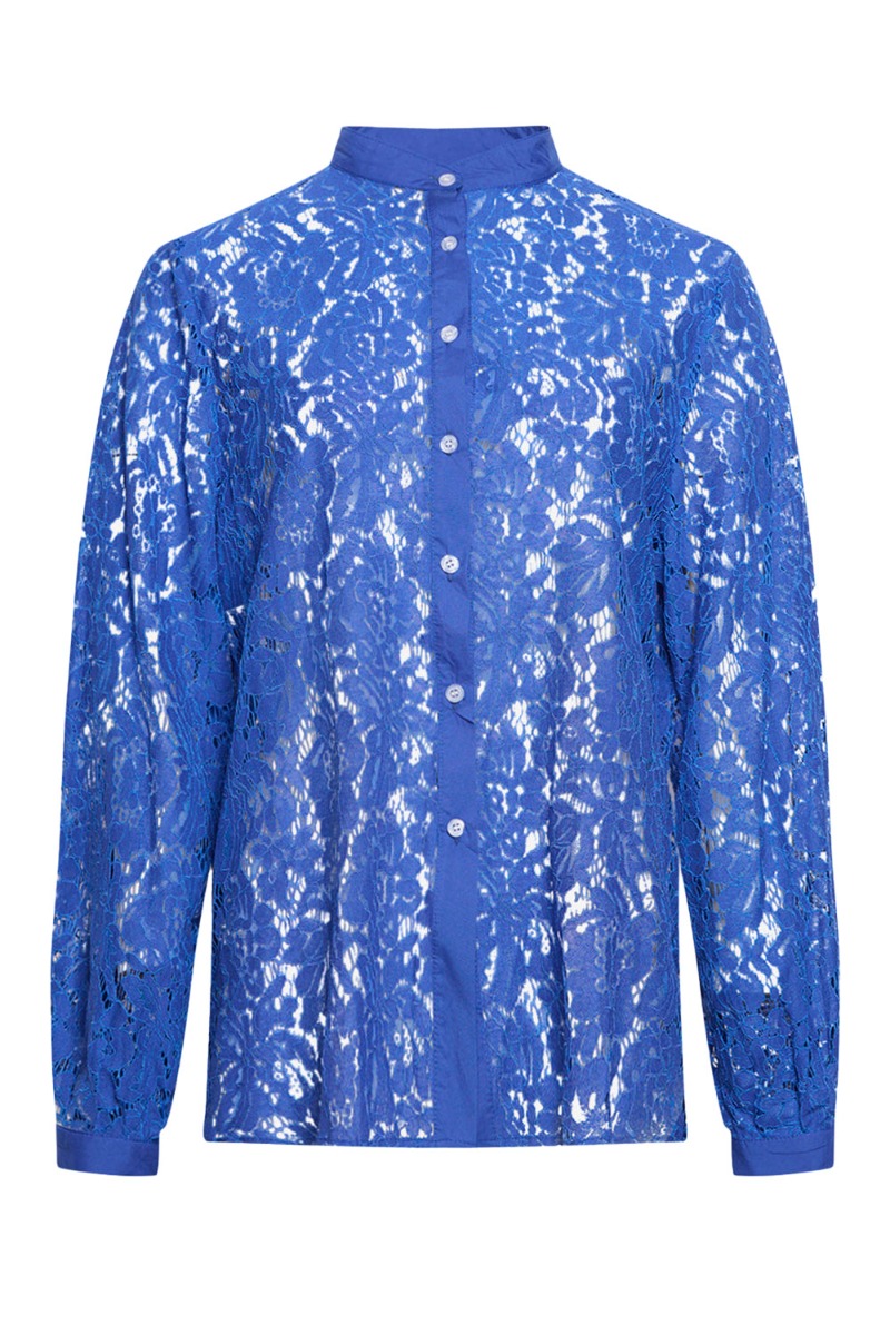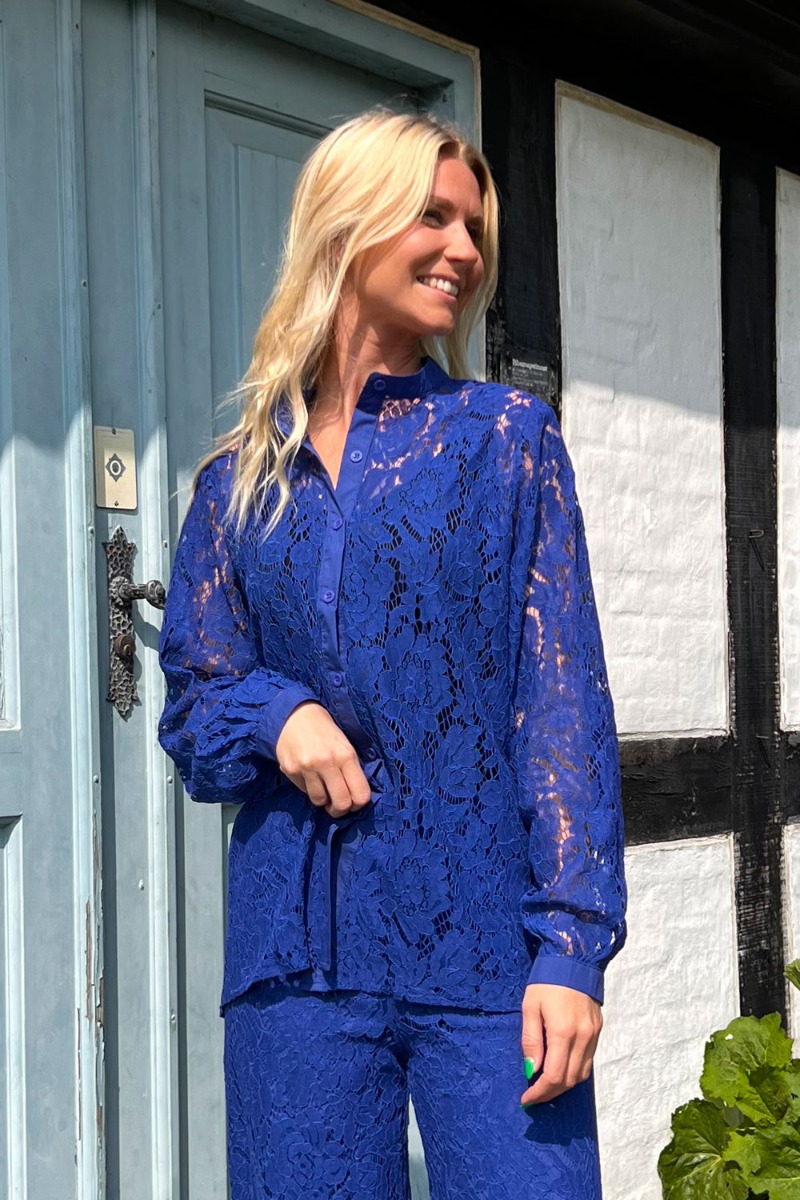 En virkelig smuk skjorte fra Noella i den fineste blomster blonde. Skjorten er rummelig med knapper foran hele vejen ned og ved håndleddet. Den er let gennemsigtig og super flot at style med de matchende blondebukser som sæt både til fest og en varm sommerdag.
