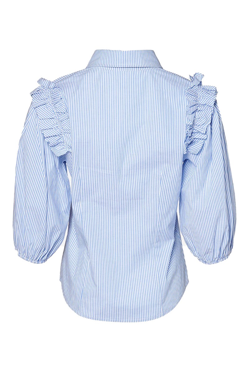 Fin sommerbluse med en flot flæsedetalje på skulderen fra Noella. Skjorten har hvid og blå stribet med knapper foran og 3/4 ærmer i et ballon-snit. Den er super sød at style til jeans eller en pæn buks.
