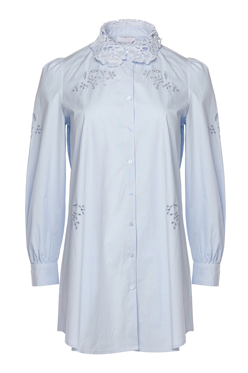 Super sød skjorte fra Noella med ekstra længde. Skjorten har den smukkeste broderet krave der lukkes foran med knapper. Den er designet med små broderidetaljer ved brystet og ærmerne og har feminine ballonærmer. Style dem over et par jeans eller "pæne" bukser.