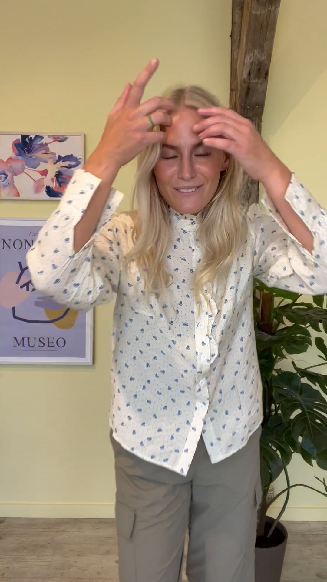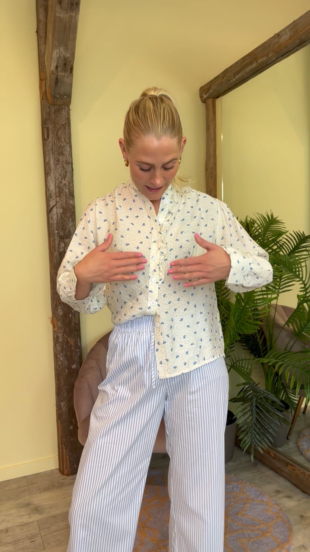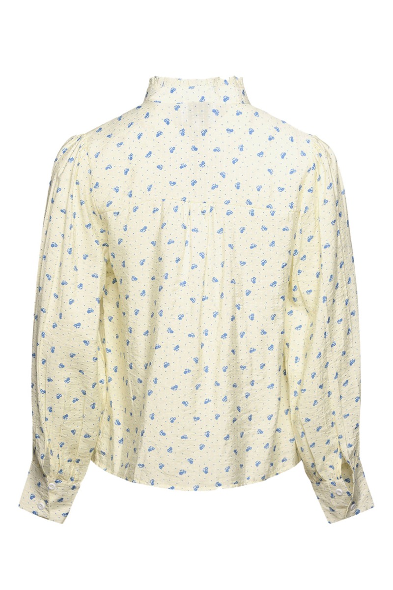 Sødeste skjorte fra Noella i et fint lille blåt blomsterprint med små prikker. Skjorten har flæsedetalje langs knapperne foran og kraven. Den har et lille pufærme og er designet i en dejlig let kvalitet.