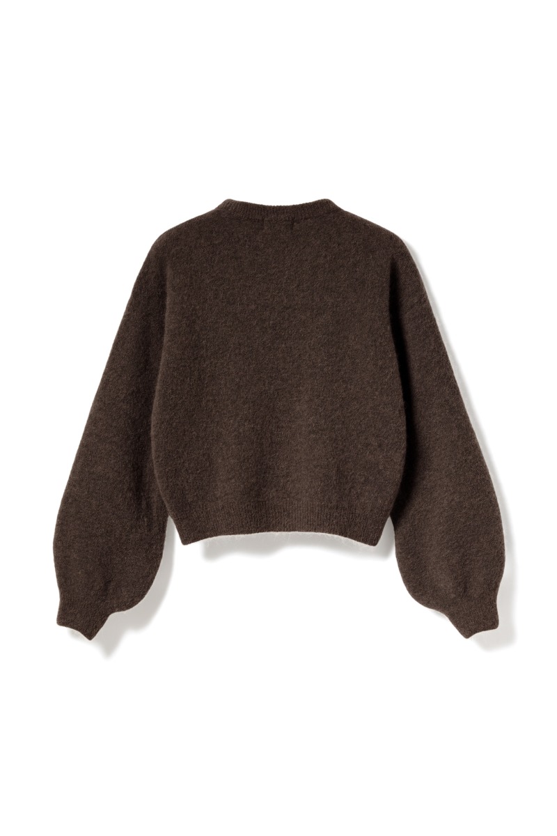 Denne striktrøje er en blød, let fluffy sweater i en dyb kaffe-brun farve. Den har en klassisk rund halsudskæring og lange, let ballonskårne ærmer, som giver et afslappet og feminint udtryk. Ribkanter ved hals, manchetter og bund skaber en pæn afslutning og hjælper sweateren med at holde formen. Pasformen er en anelse cropped og boxy, hvilket gør den oplagt både til højtaljede bukser og nederdele. Sweateren fremstår varm, cozy og perfekt til efterår og vinter.