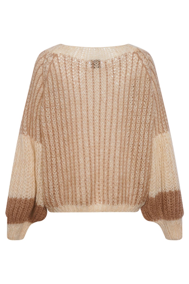 En lækker strik som vi faktisk kender fra tidligere. Den er fra Noella og i denne løse pasform som nemt kan bruges til hvilken som helst underdel. Den har store løse ærmer med masser af balloneffekt. Den findes i flere farver men her er den i råhvid og brun.