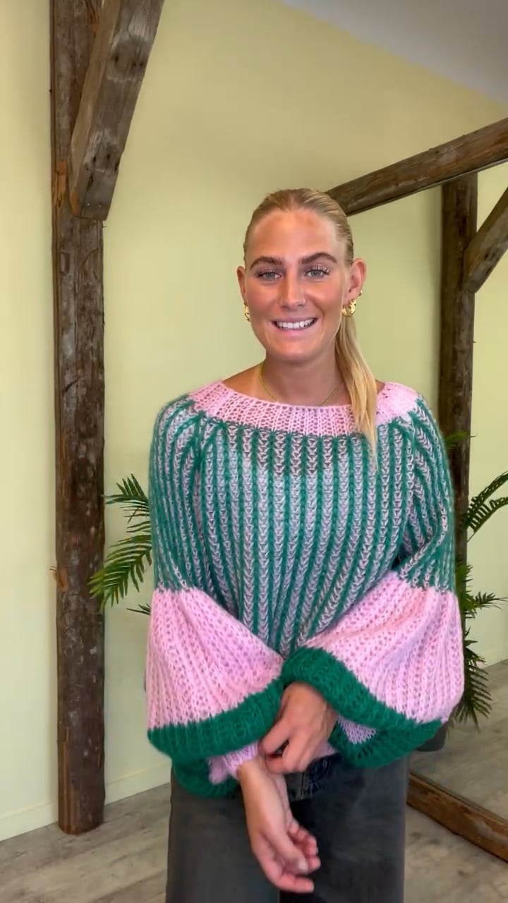 Noella strik i lyserød med grønt mønster. Strikken er lavet i en let strikkvalitet i en rummelig pasform med en vig udskæring. De lange ærmer afsluttes med en bred balloneffekt i bunden og er super skøn til de kolde efterårsdage.