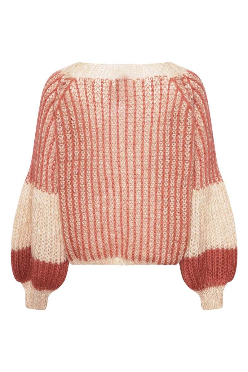 Noella strik i creme med rosa mønster. Strikken er lavet i en let strikkvalitet i en rummelig pasform med en vig udskæring. De lange ærmer afsluttes med en bred balloneffekt i bunden og er super skøn til de kolde efterårsdage.