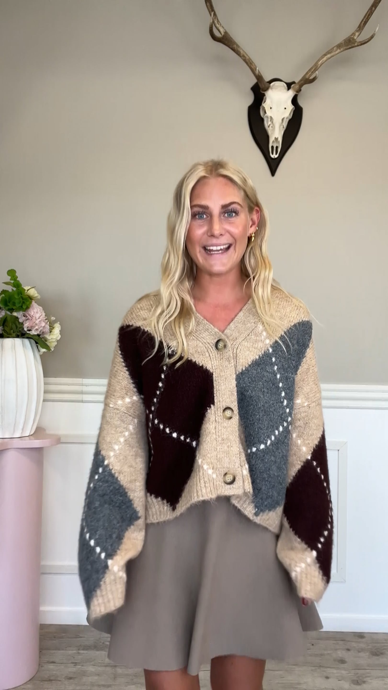 Den lækreste bløde strik cardigan fra Noella bliver et kæmpe hit denne sæson. Cardiganen er super cool med et ternet mønster og i skønne jordfarver. Den lukkes foran med gennemgående knapper der skaber en fin v-udskæring og gør den super cool at bruge både over t-shirt, skjorte eller alene lukket.