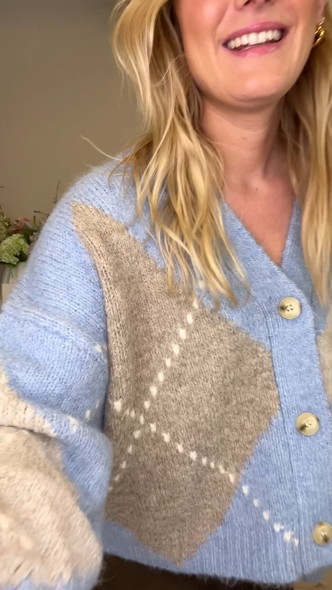 Cardiganen har et blødt argyle-mønster i lyseblå og beige, som giver et roligt og feminint udtryk, og den dybe V-udskæring med knapper gør den nem at style både åben og lukket, alt efter om du vil have et afslappet eller mere pænt look. Materialet ser fluffy og varmt ud, så den er perfekt til kølige dage, hvor du stadig gerne vil se velklædt ud. Pasformen virker let oversized, hvilket giver en moderne silhuet og gør den behagelig at have på hele dagen. Den kan nemt matches med lyse jeans, beige bukser eller en enkel nederdel for et harmonisk outfit.