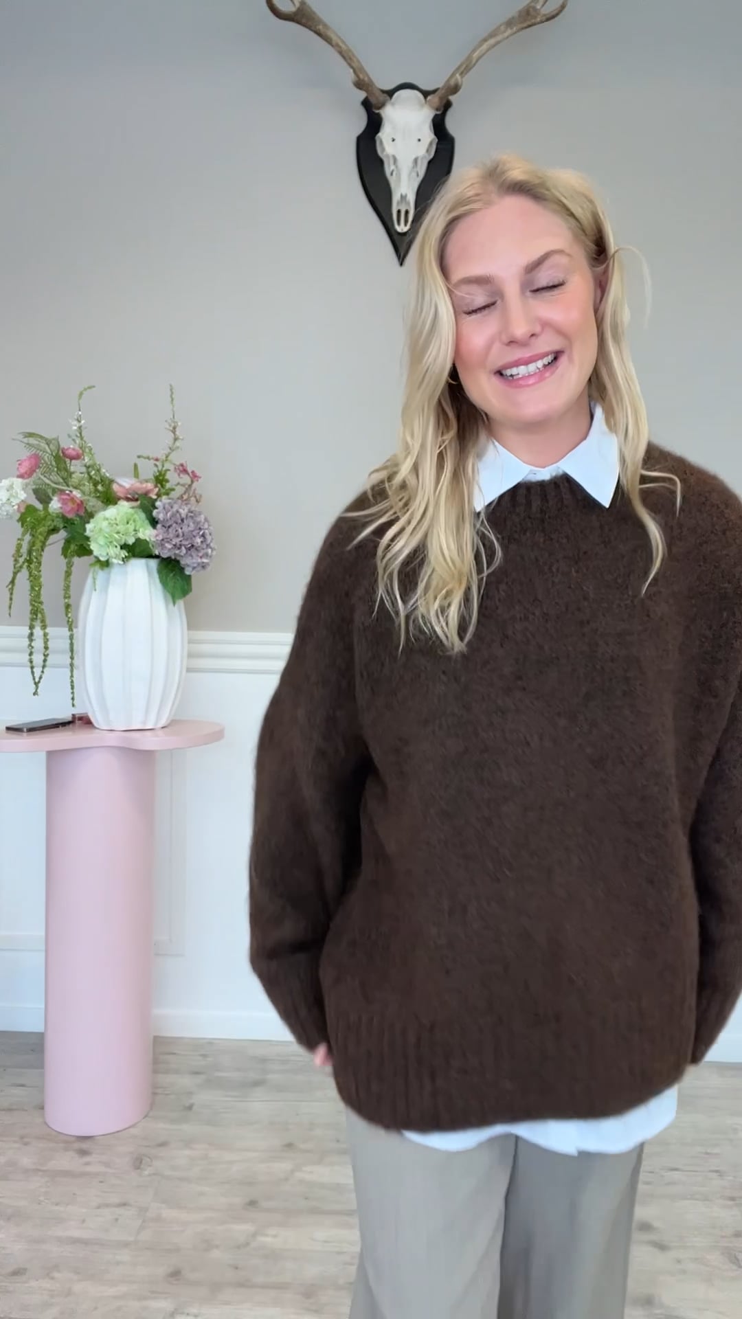 Strikken har et enkelt og tidløst design i en dyb brun farve, som giver et varmt og klassisk udtryk. Materialet ser blødt og let fluffy ud, hvilket giver en hyggelig og komfortabel fornemmelse. Den har rund halsudskæring, lange ærmer og ribkanter ved hals, manchetter og bund. Pasformen virker afslappet med en lige silhuet, der gør den nem at kombinere med både bukser og nederdele. Samlet er det en alsidig basisstrik, der passer godt til hverdagsbrug og lag-på-lag styling.