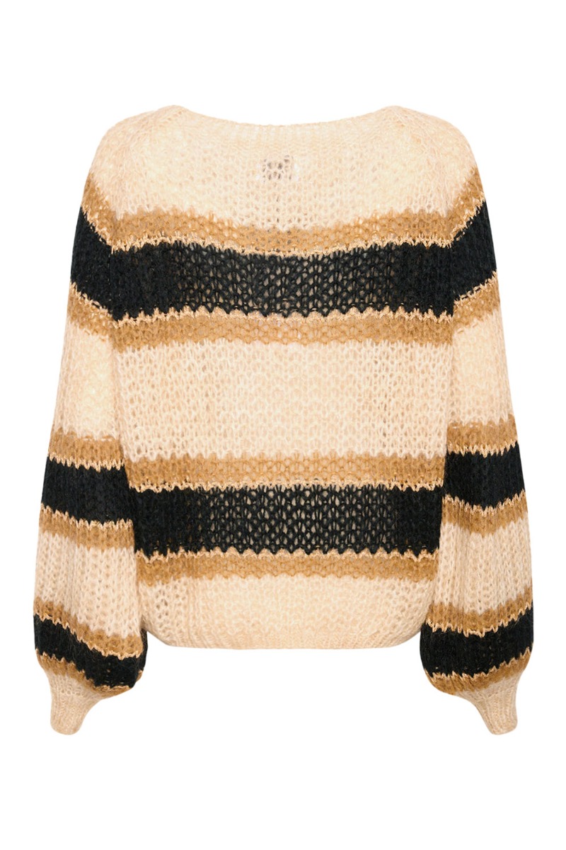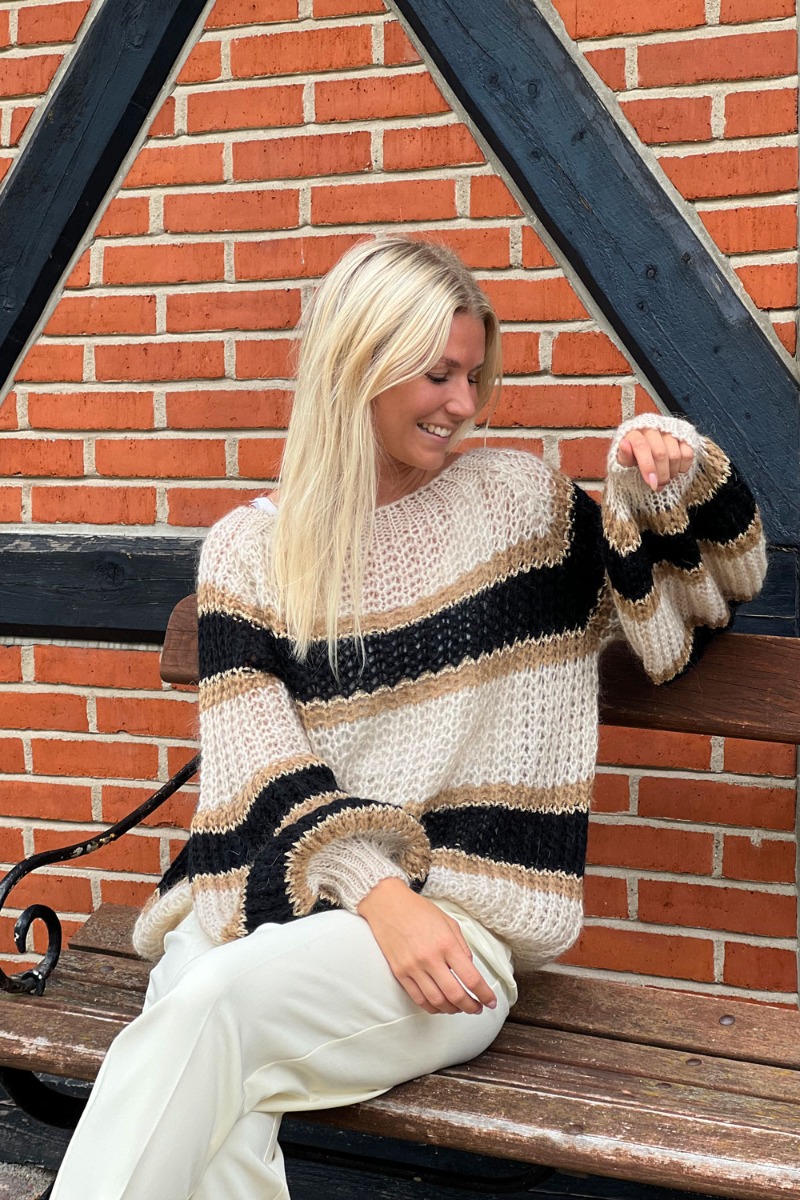 Lækreste strik fra Noella i brune flotte nuancer der er perfekt her til efteråret med bukser til. Strikken er i en let og behagelig blød kvalitet med rund hals og lange løse ballonærmer. Den er designet med en sød lille guld glimmer detalje i striben.