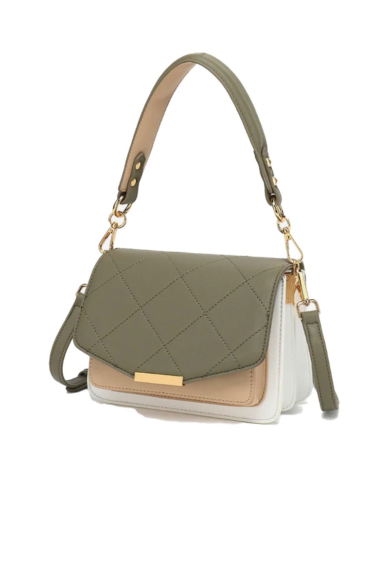 Tasken er kommet i denne smukke beige, army og hvide farvekombination som har et eksklusivt look. Den har en "klap" lukning foran og flere små rum indvendigt hvor du kan gemme alle dine nipse ting.
